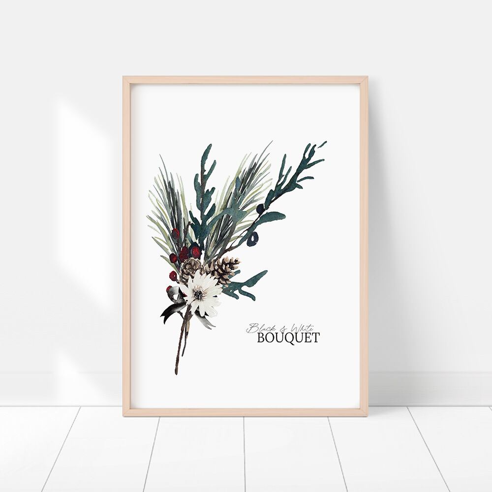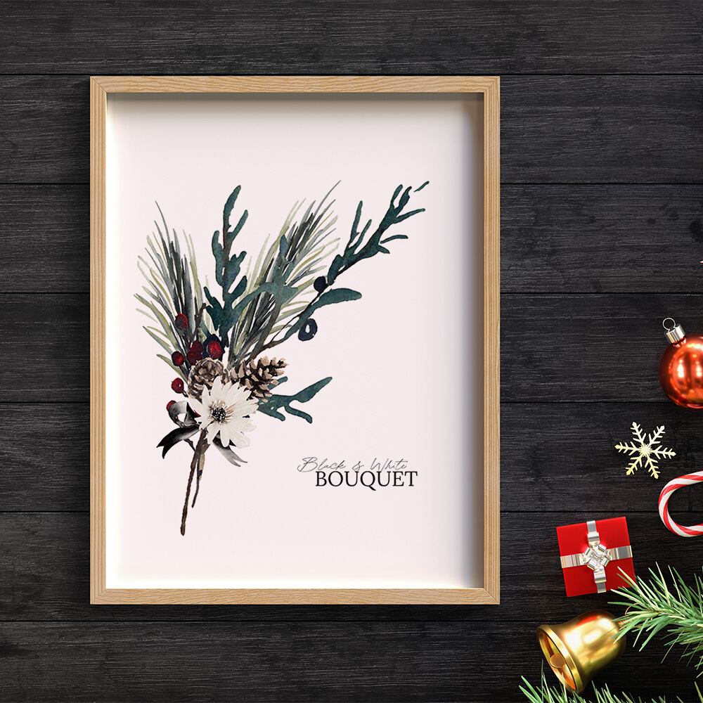 モノトーンのクリスマスポスターです。クリスマスツリーやリース、ブーケ、キャンドルなどが、黒を中心にしたモノトーン色で描かれています。大人っぽいシックなクリスマスの雰囲気になります。