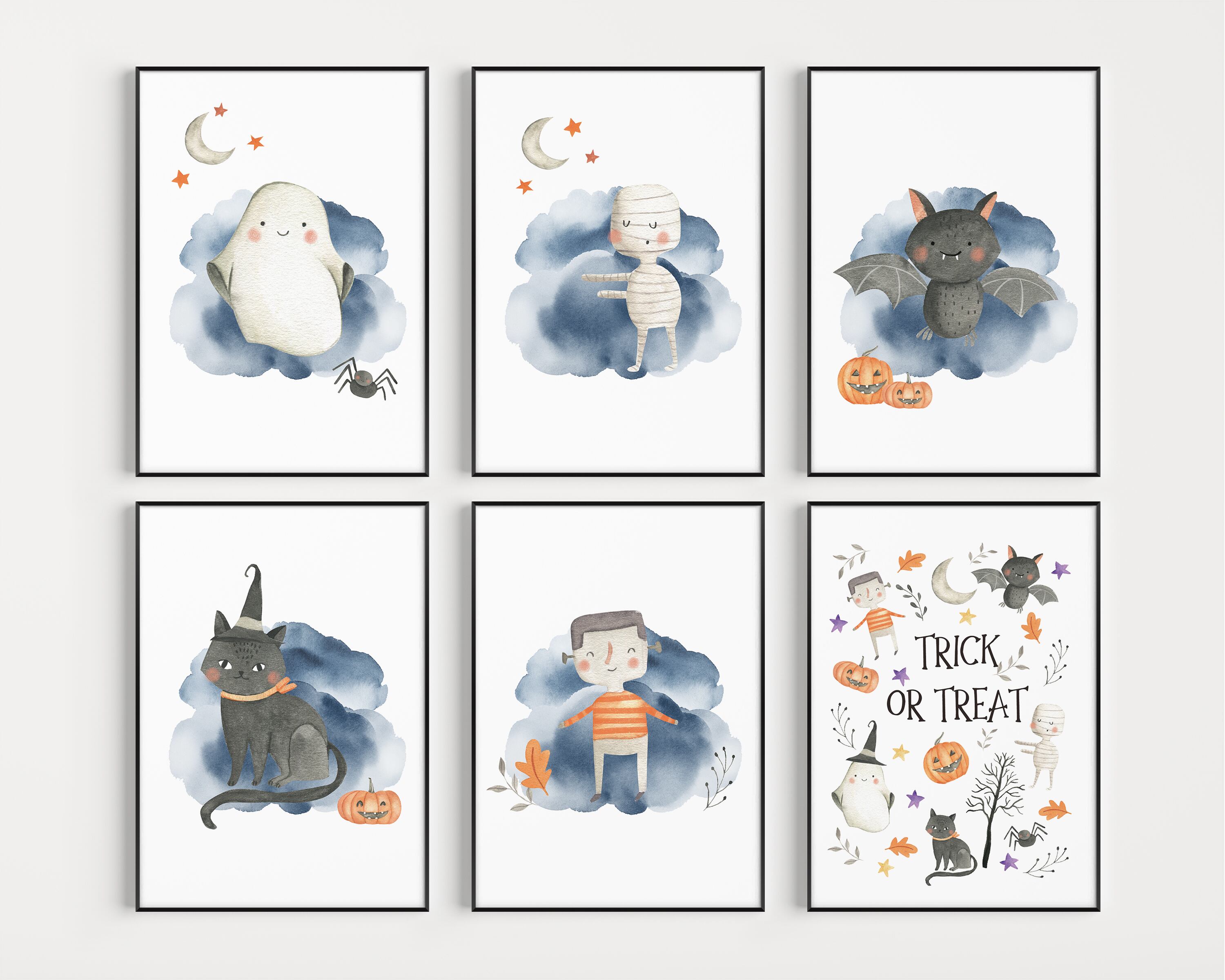 子供部屋にぴったりな、キッズハロウィンポスターです。オバケやかぼちゃ、コウモリ、黒猫、フランケン、ミイラ男など、ハロウィンのキャラクターが勢揃い。可愛らしいイラストです。