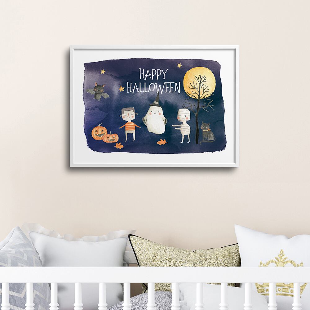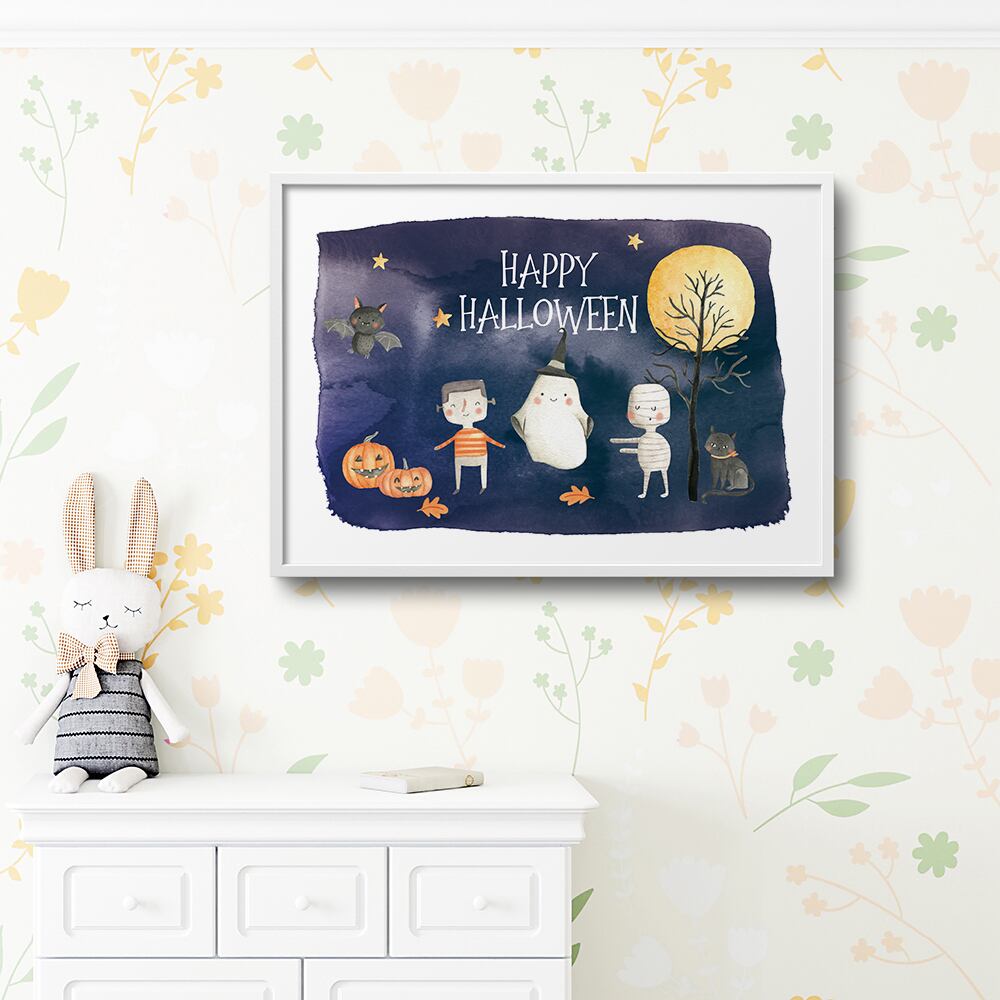 子供部屋にぴったりな、キッズハロウィンポスターです。オバケやかぼちゃ、コウモリ、黒猫、フランケン、ミイラ男など、ハロウィンのキャラクターが勢揃い。こちらは、背景があるバージョンになります。