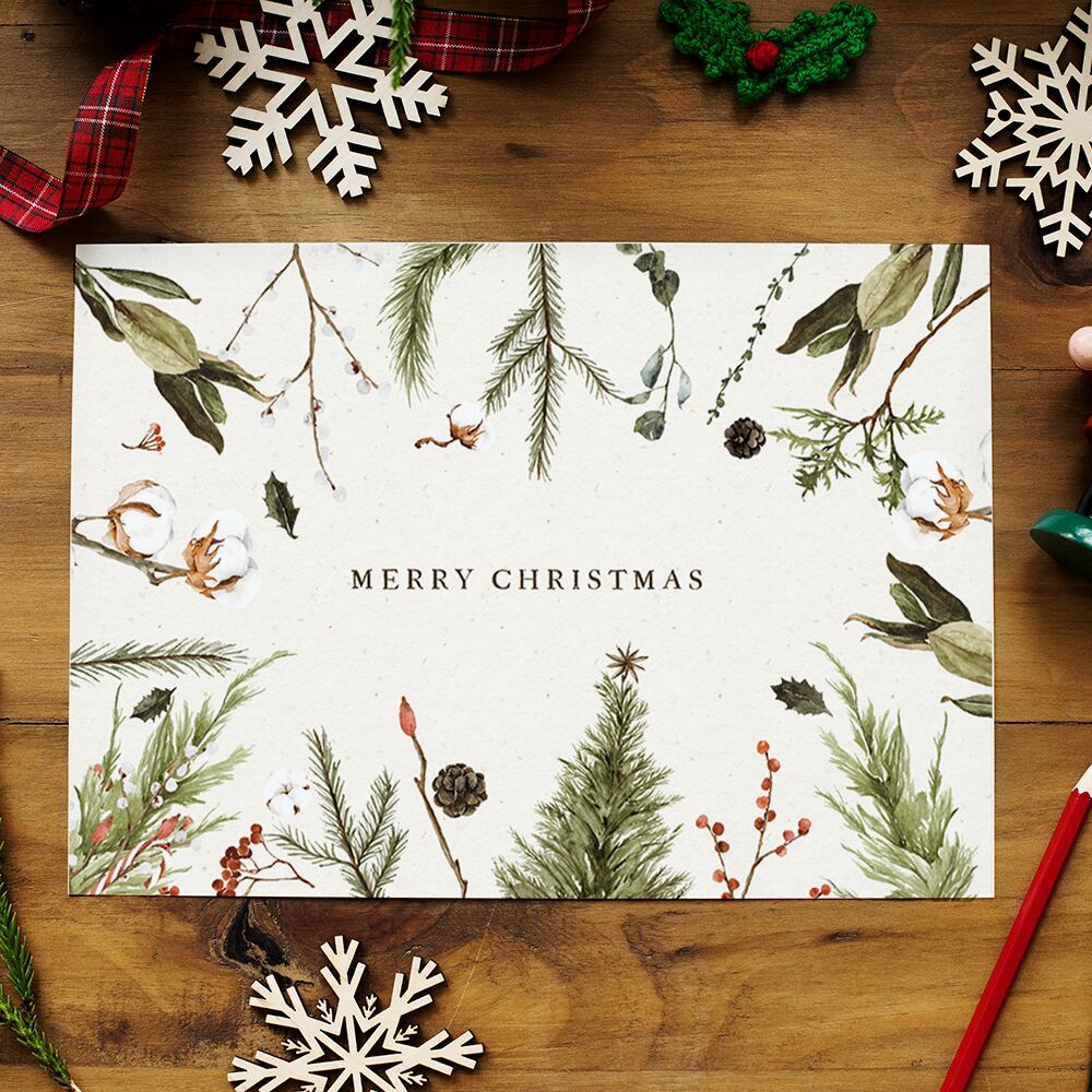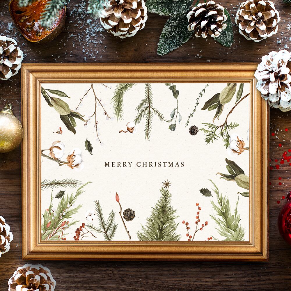 クリスマスポスターです。クリスマスツリーや靴下、セーターやプレゼント、パーティーの様子などが、あたたかみのある水彩画で描かれています。ベージュやアースカラーを基調にした、優しいデザインです。