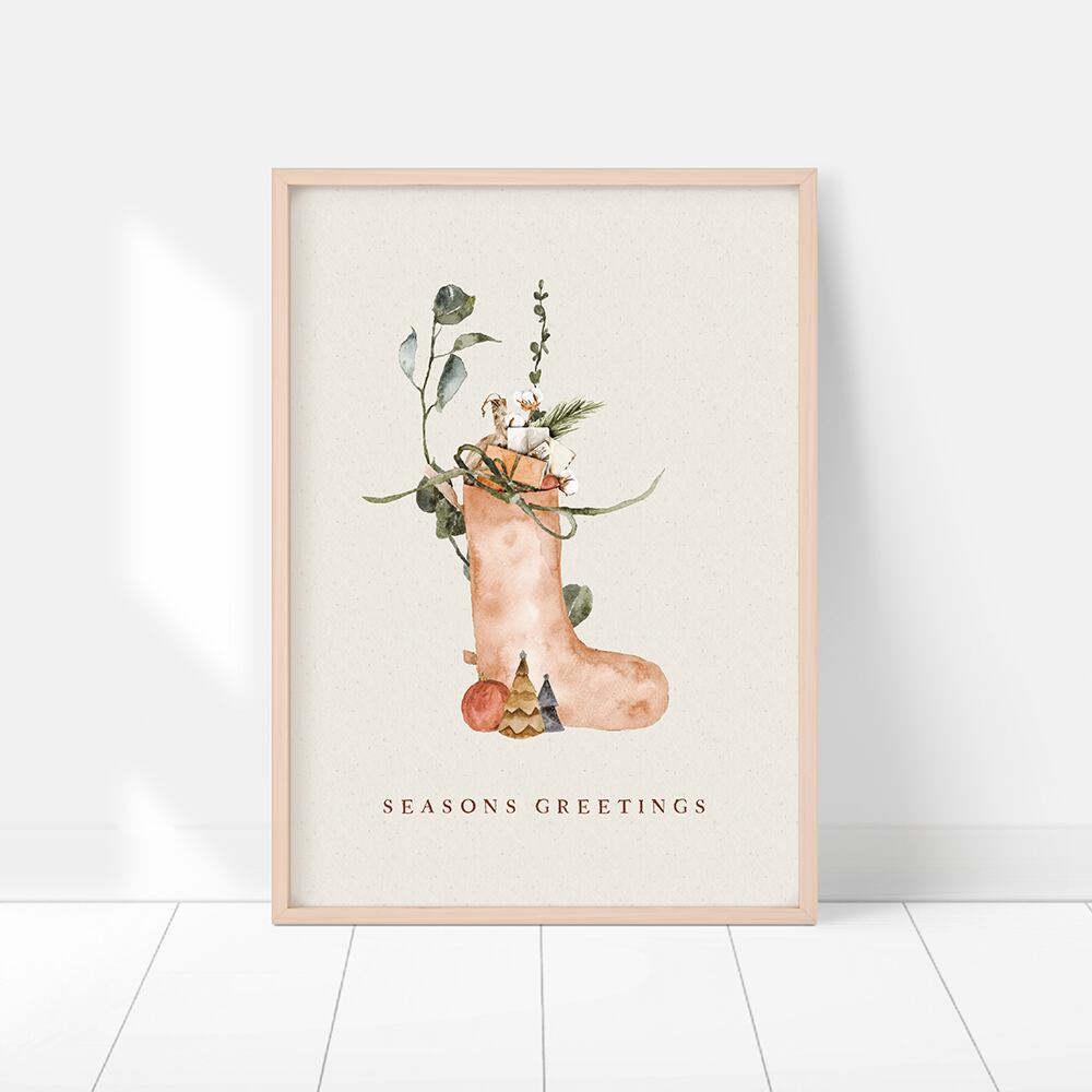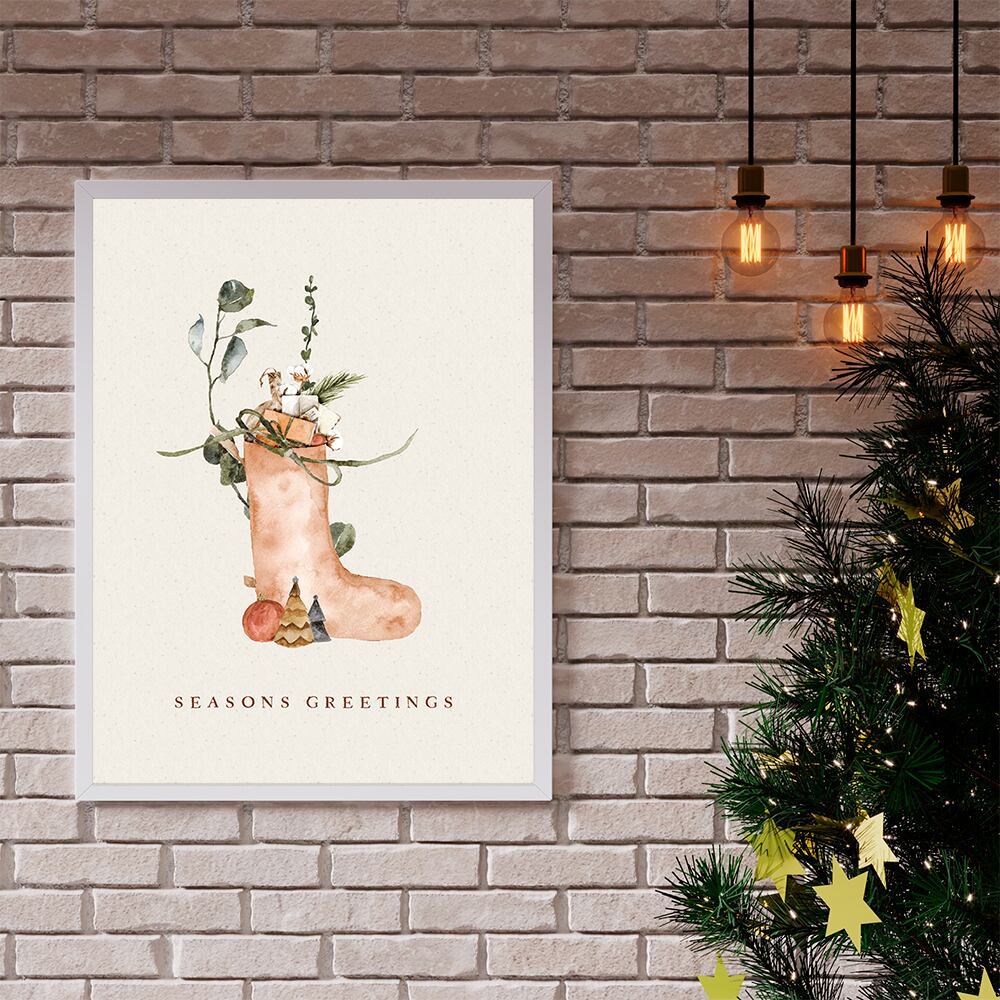 クリスマスポスターです。クリスマスツリーや靴下、セーターやプレゼント、パーティーの様子などが、あたたかみのある水彩画で描かれています。ベージュやアースカラーを基調にした、優しいデザインです。