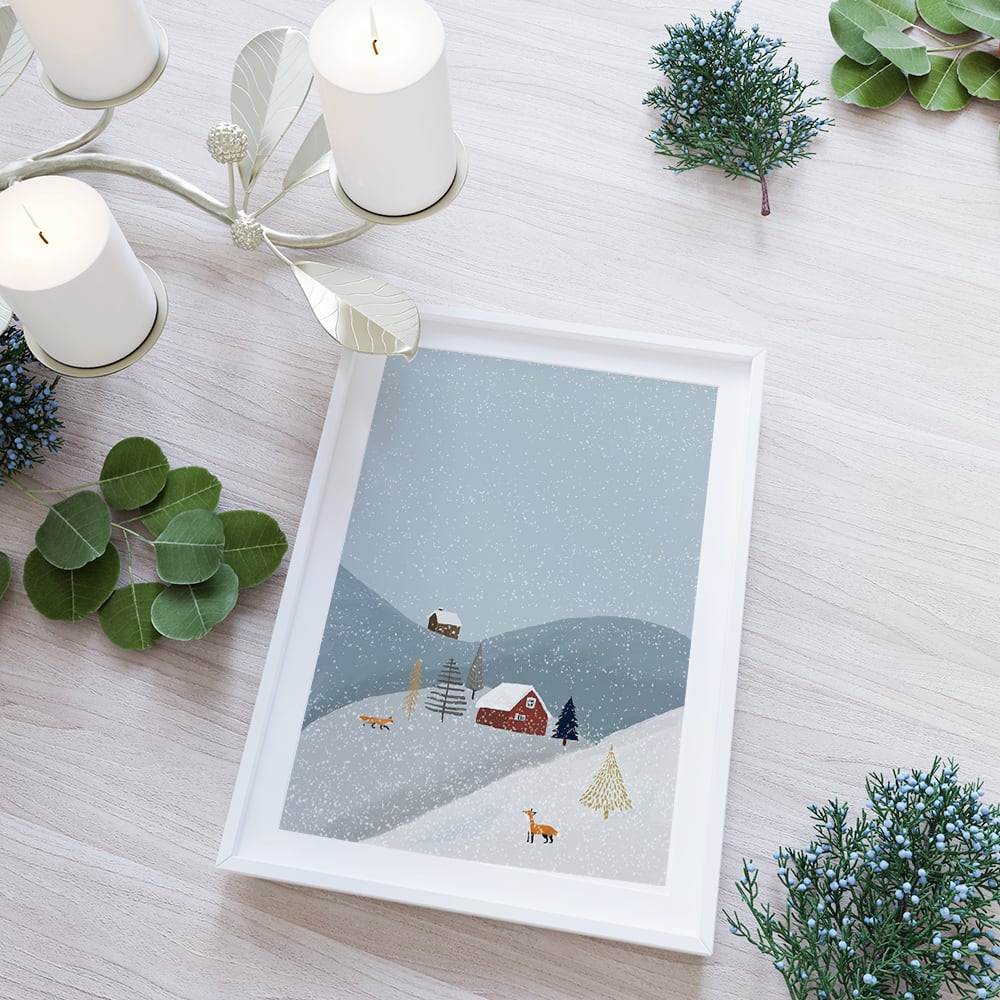 北欧のクリスマスです。雪景色とその中で楽しそうにスケートをして遊ぶ人々、クリスマスツリー、ポインセチアやクリスマスアイテムなどが描かれています。ブルーグレーをベースに、ベージュやグレージュを使ってナチュラルに仕上げました。ミニチュアのような世界観をお楽しみください。