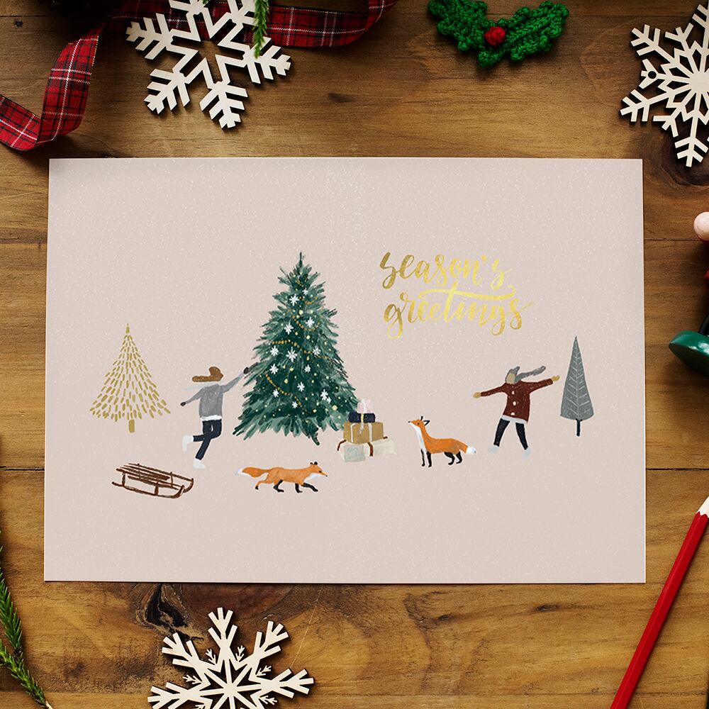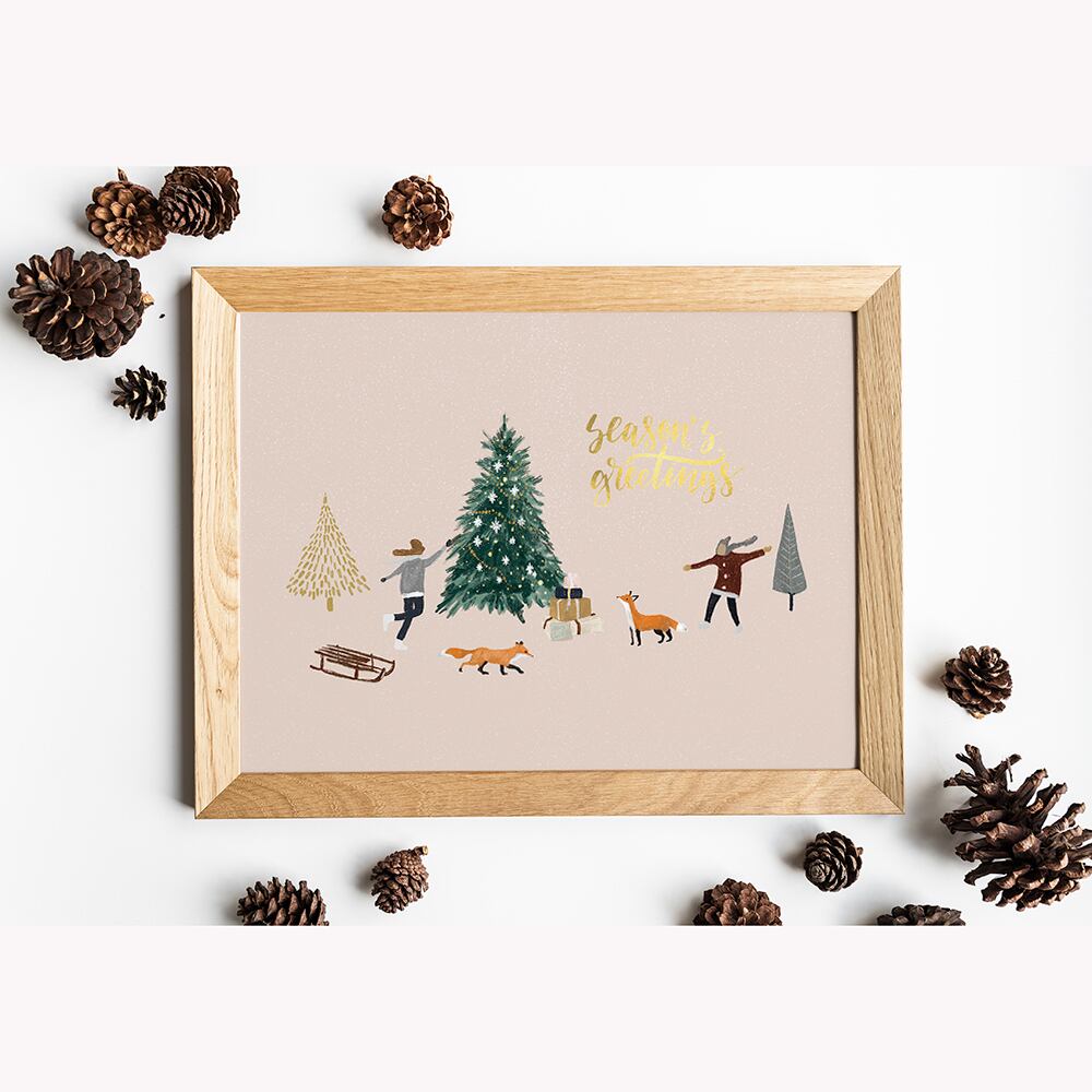 北欧のクリスマスです。雪景色とその中で楽しそうにスケートをして遊ぶ人々、クリスマスツリー、ポインセチアやクリスマスアイテムなどが描かれています。ブルーグレーをベースに、ベージュやグレージュを使ってナチュラルに仕上げました。ミニチュアのような世界観をお楽しみください。