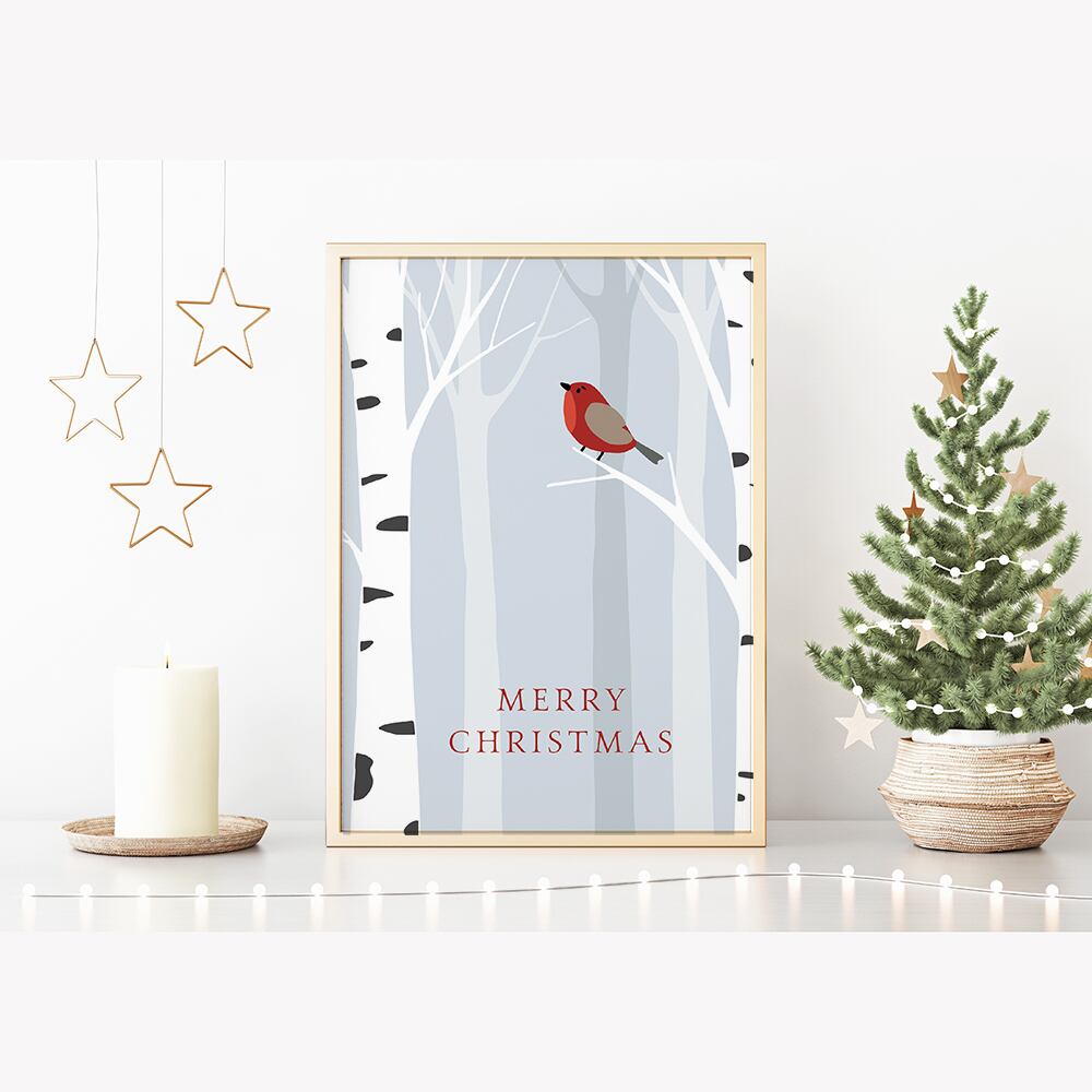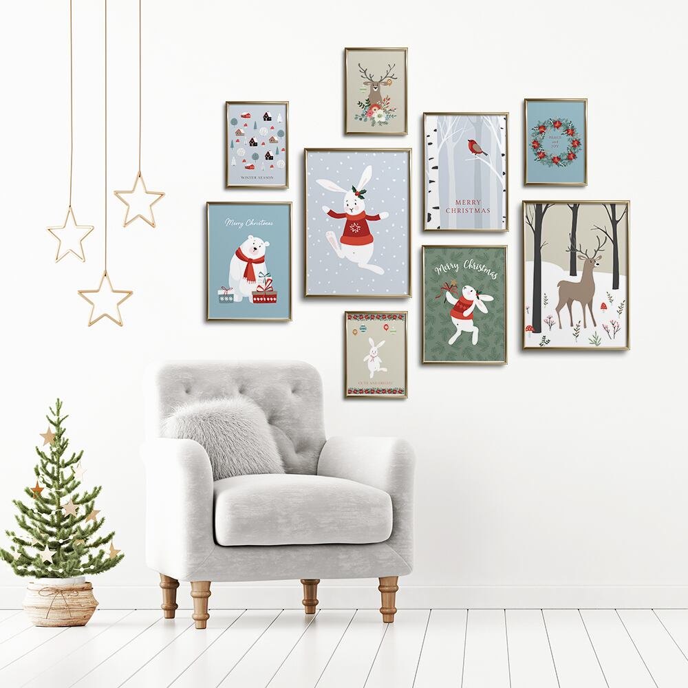 可愛いうさぎ、鹿、シロクマ、小鳥などが描かれた、クリスマスポスターです。青と赤のコントラストも、クリスマスには珍しい色合いで、新鮮さが感じられます。お子様にはもちろん、大人可愛いテイストが好きな方にもおすすめです。