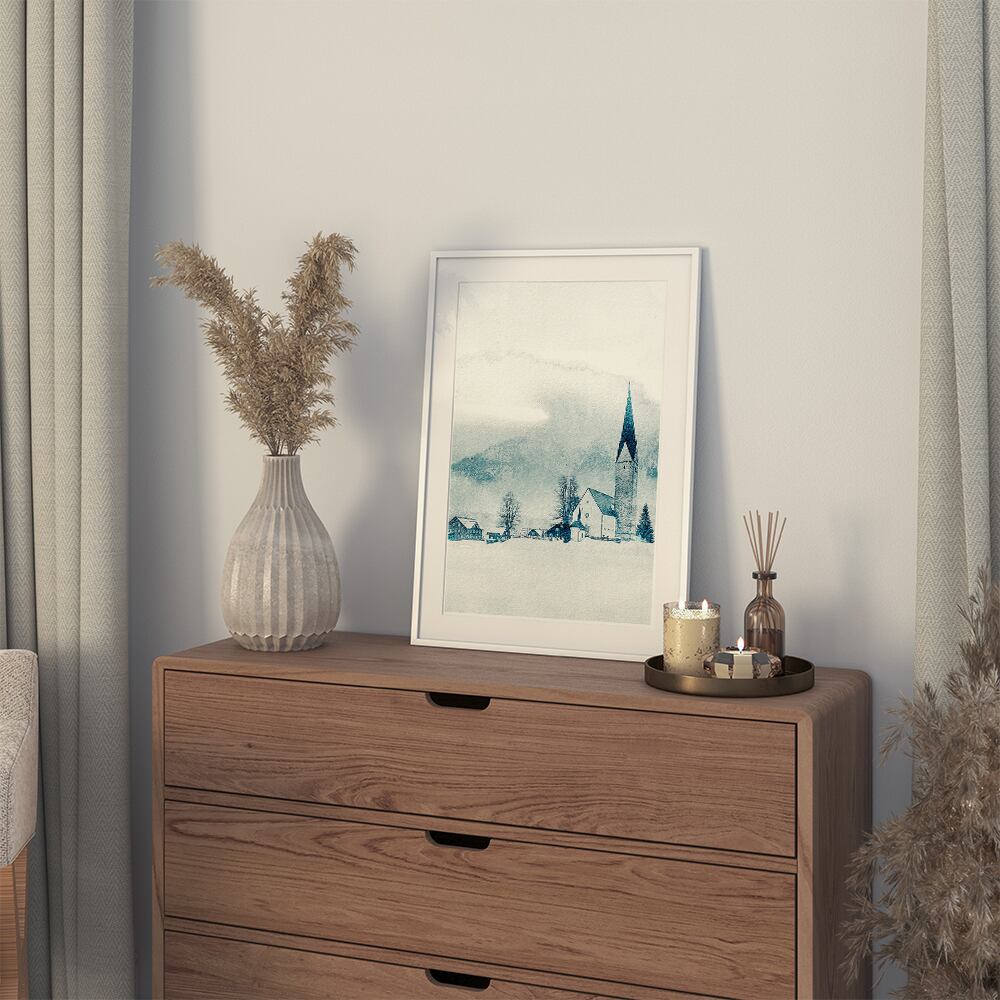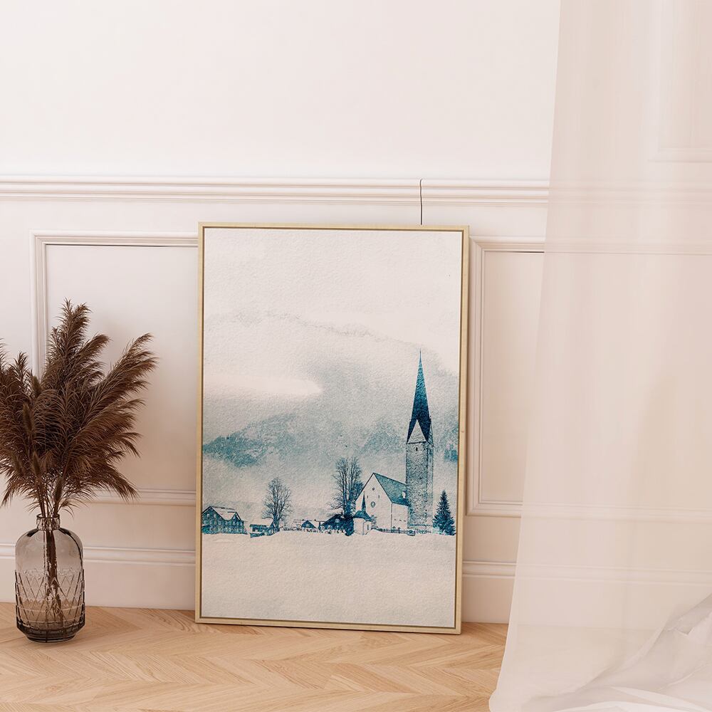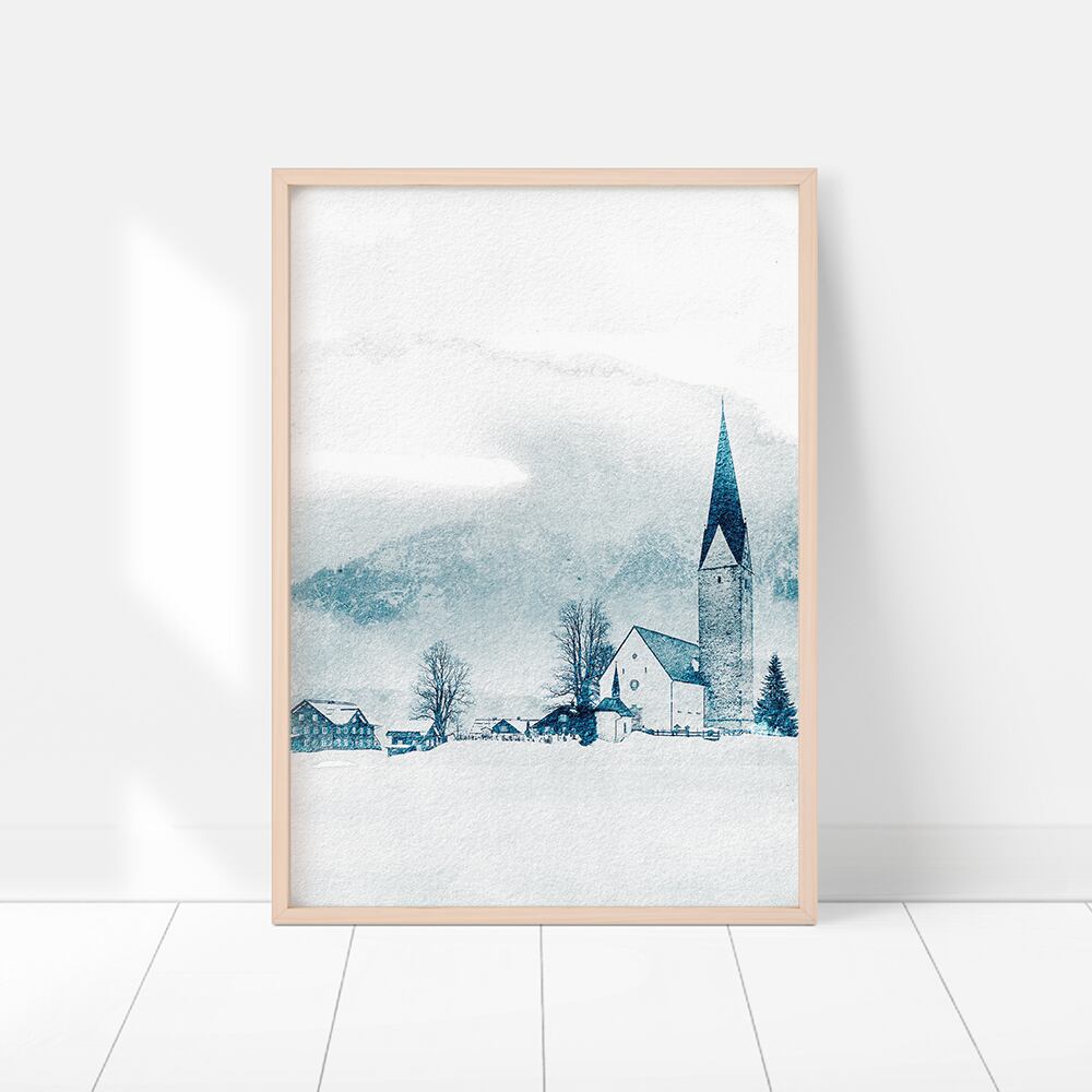 冬景色のポスターです。真っ白な雪の中の、家や木々、動物たちが描かれています。使っている色もシンプルで、モダンで落ち着いた雰囲気のあるポスターです。