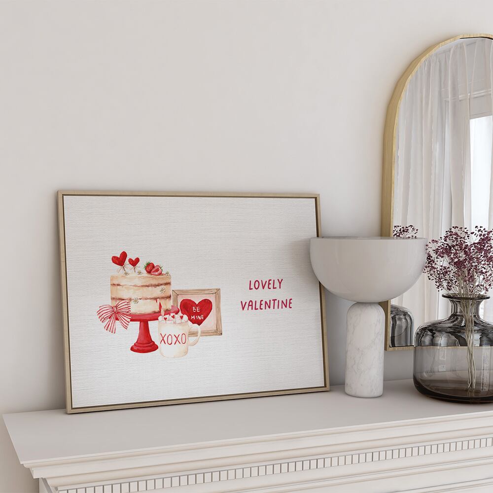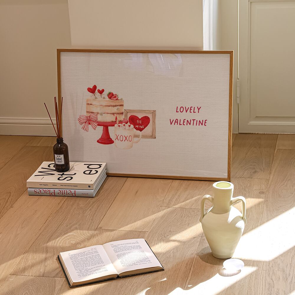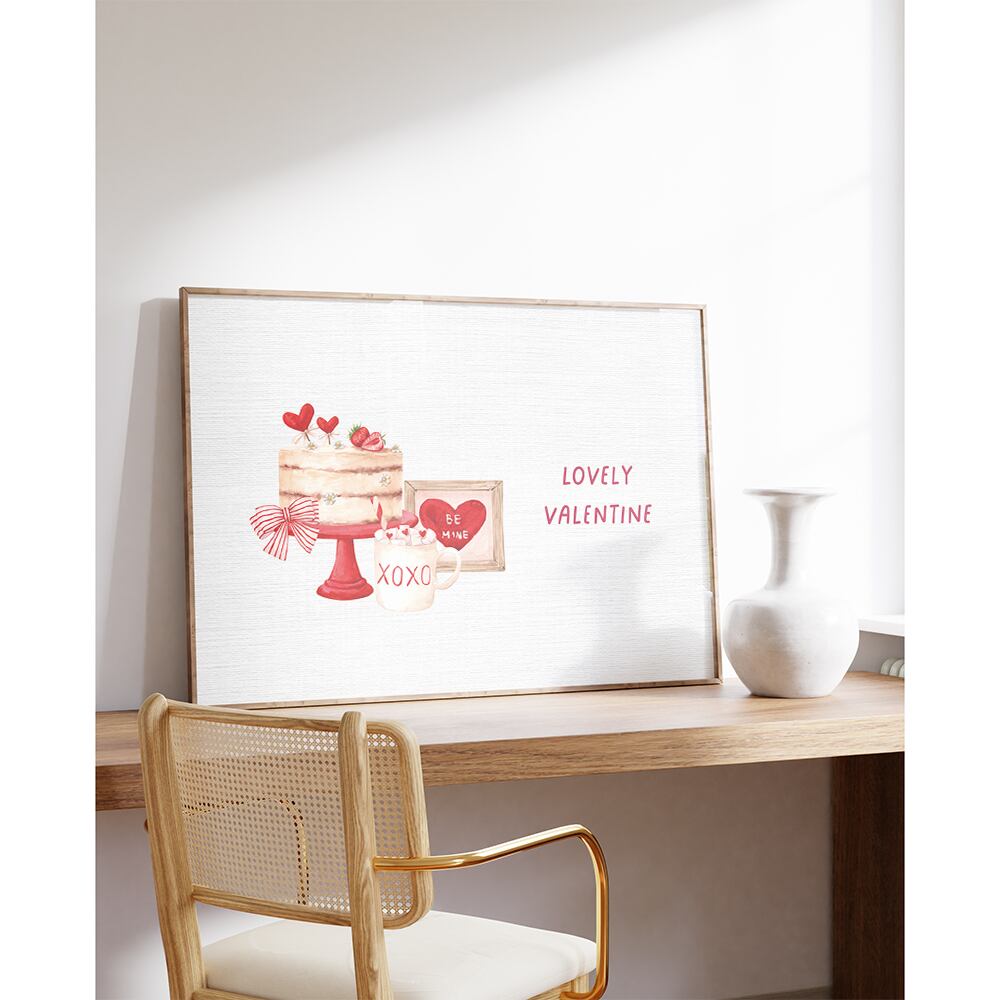 バレンタインのポスターです。家やクッキー、カップケーキやドリンクが、ハートモチーフで可愛く彩られています。ウェルカムポスター、キッチンポスター、女の子のお部屋にもおススメです♪