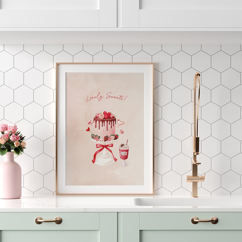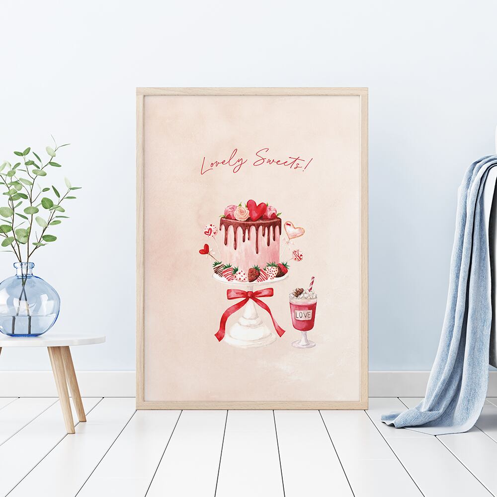 バレンタインのポスターです。家やクッキー、カップケーキやドリンクが、ハートモチーフで可愛く彩られています。ウェルカムポスター、キッチンポスター、女の子のお部屋にもおススメです♪