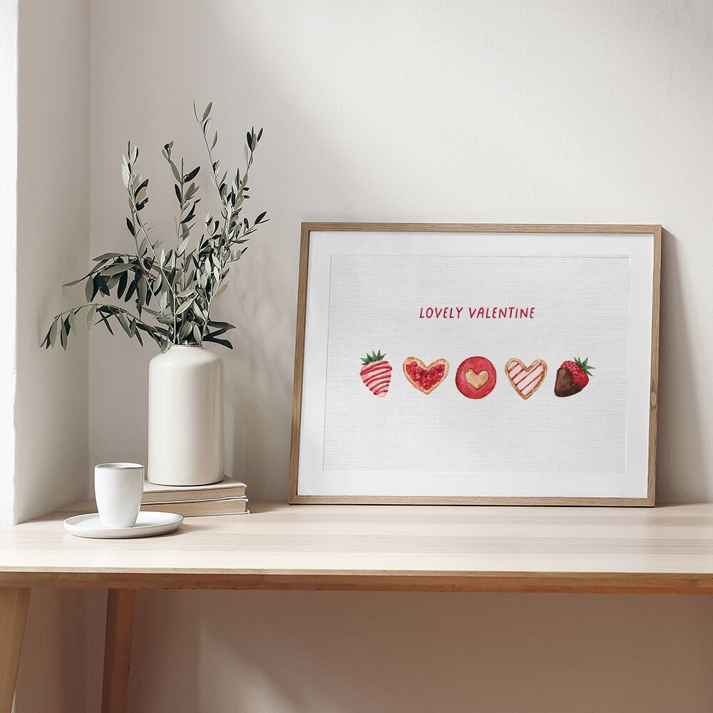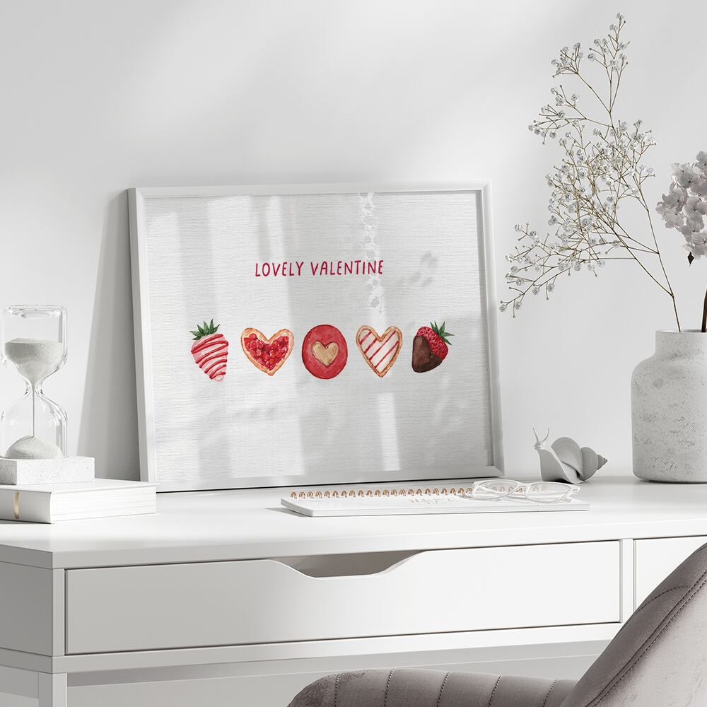 バレンタインのポスターです。家やクッキー、カップケーキやドリンクが、ハートモチーフで可愛く彩られています。ウェルカムポスター、キッチンポスター、女の子のお部屋にもおススメです♪