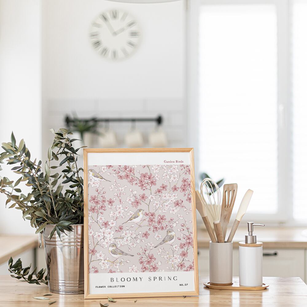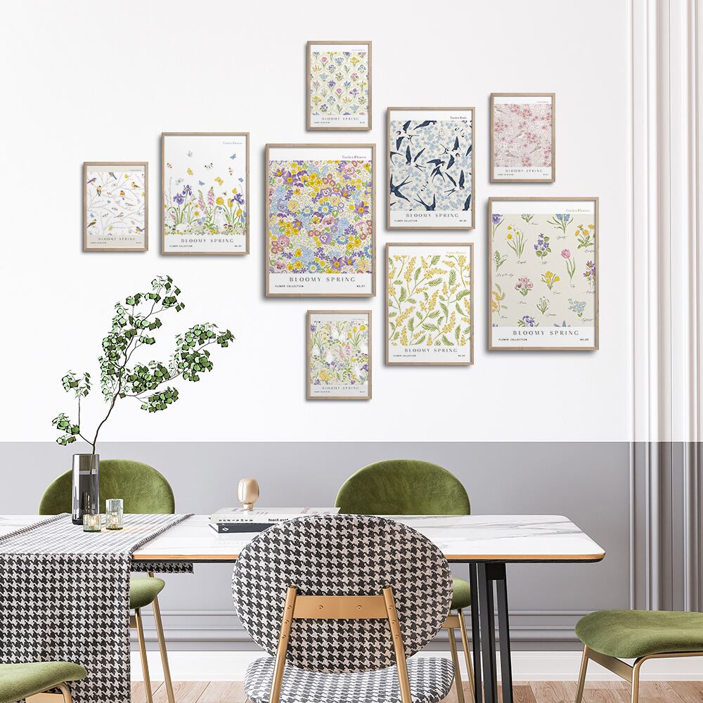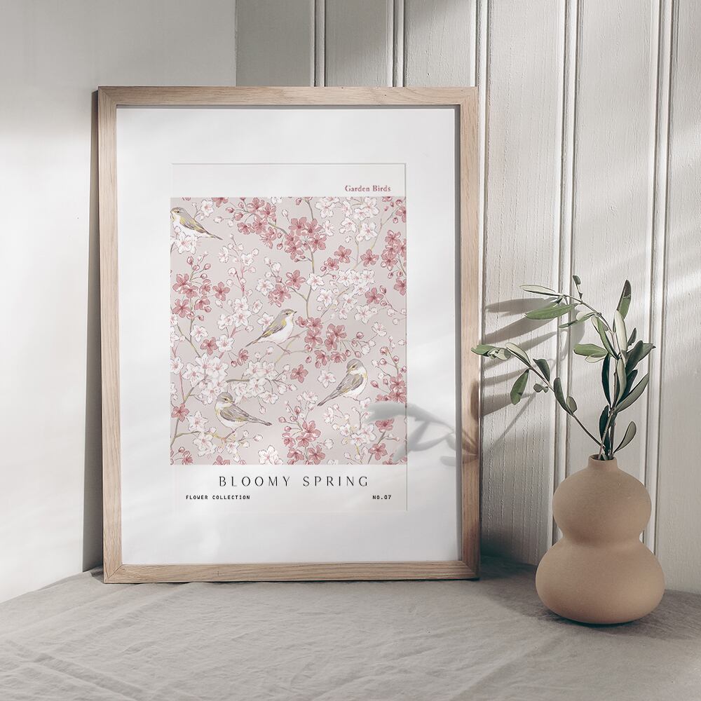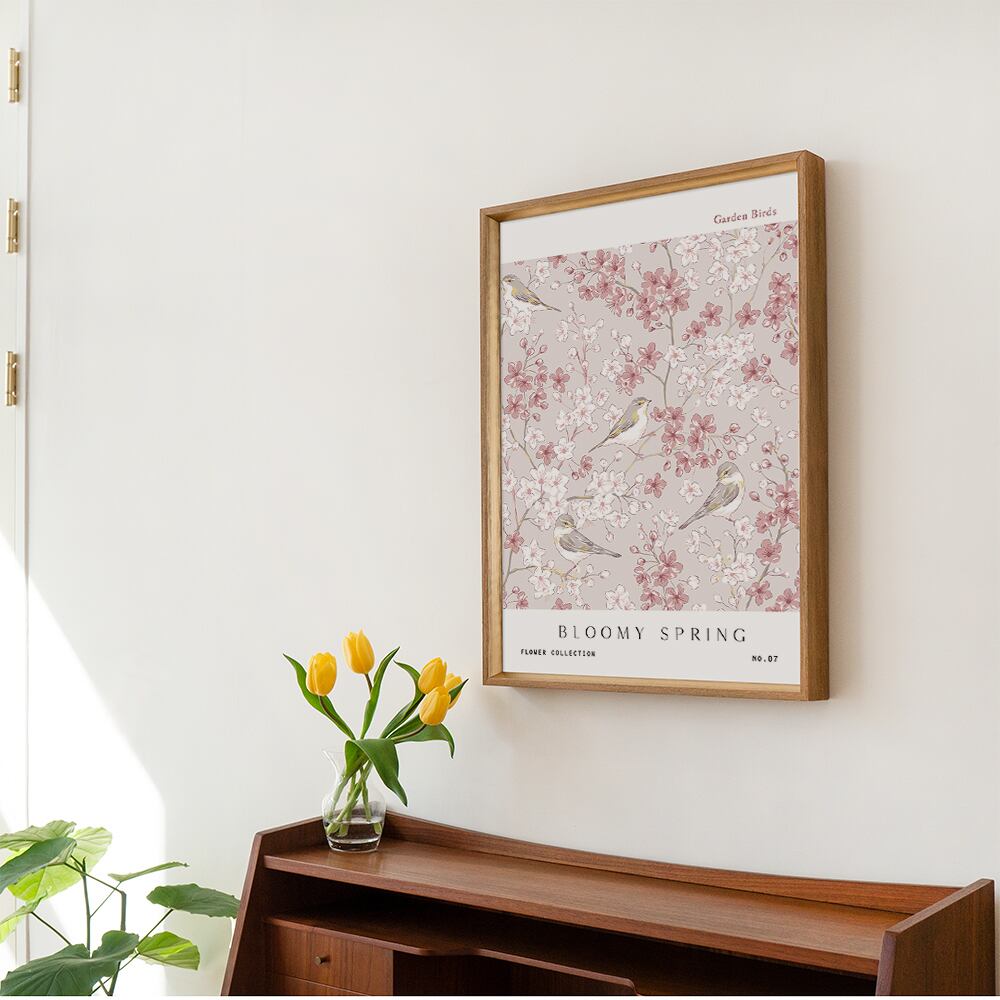 春の庭のポスターです。チューリップやミモザ、ビオラやアイリスなどの春の花、ツバメなどの鳥たち、うさぎやちょうちょなど、春のモチーフがいっぱいです!英字を入れて、ナチュラルながらもちょっとおしゃれな雰囲気に仕上げてみました。