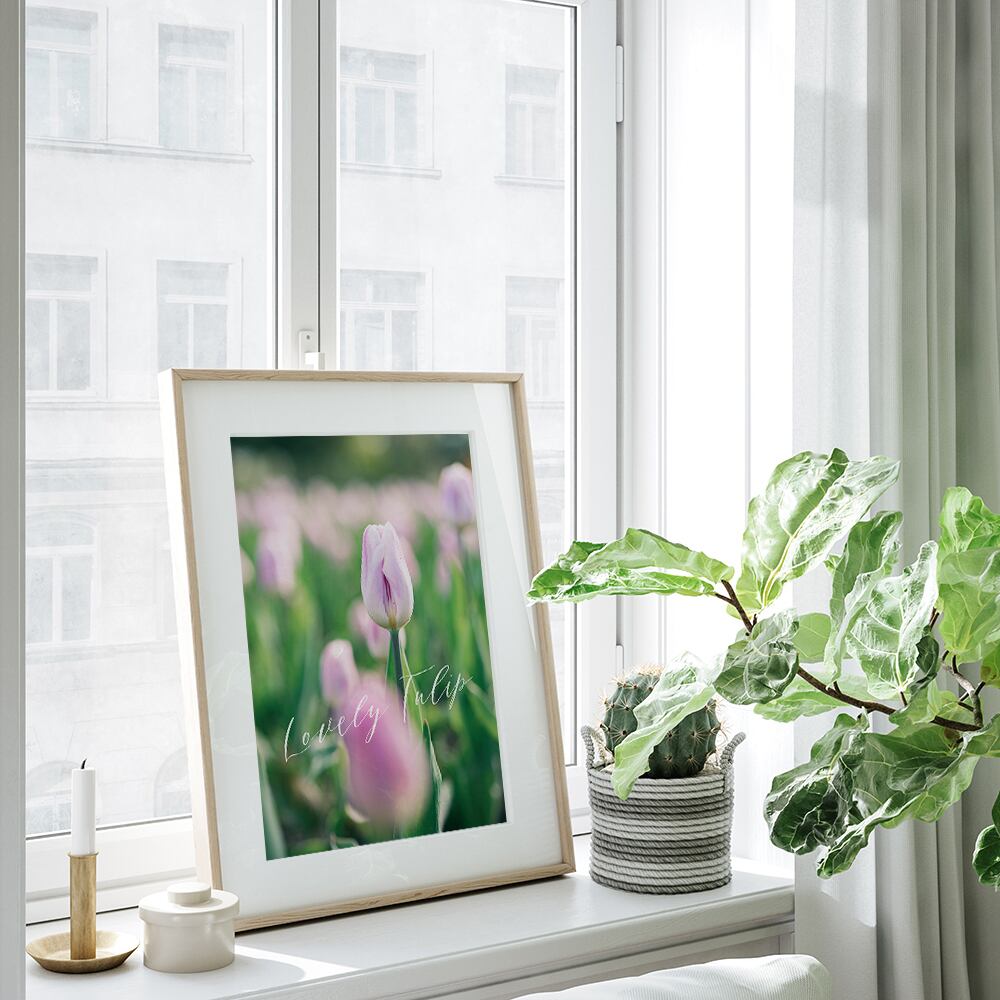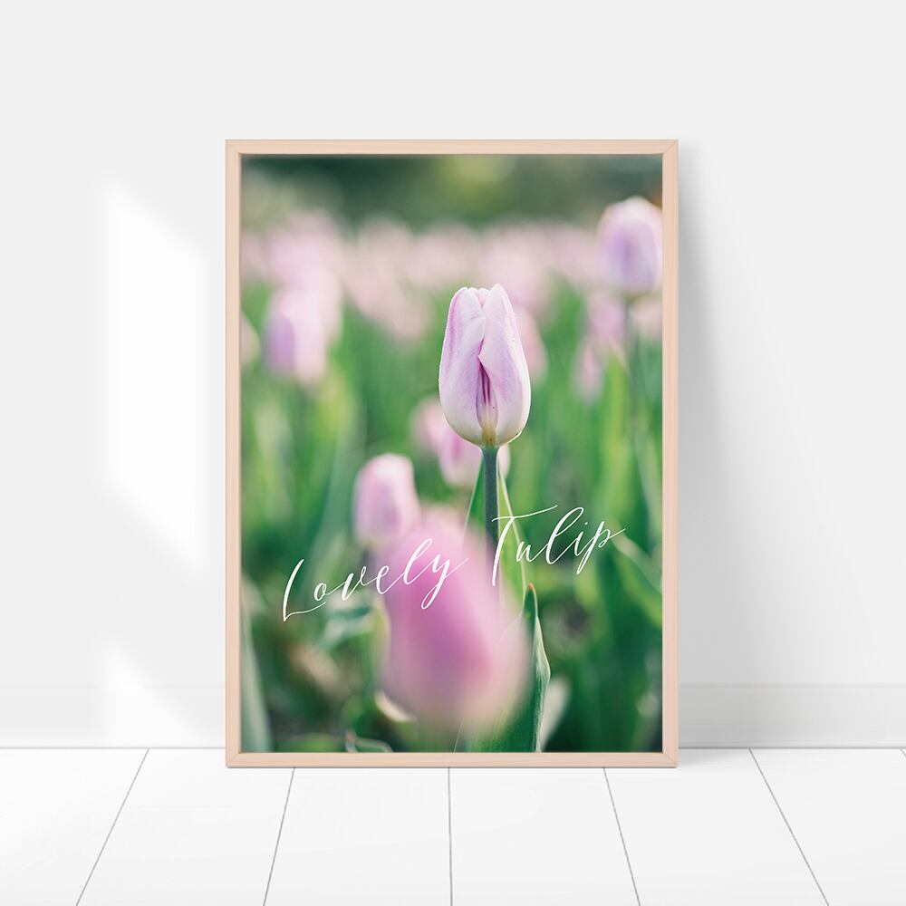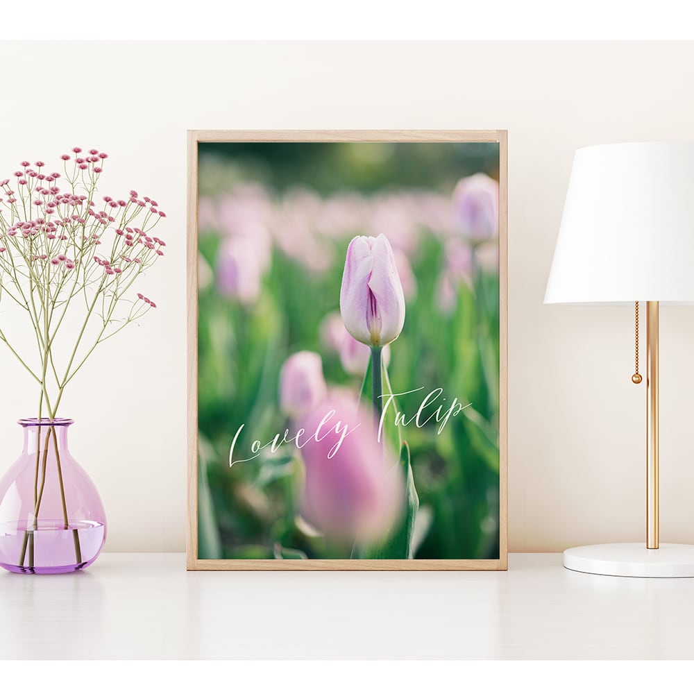春にぴったりなチューリップのフォトポスターです。ピンク、パープル、オレンジ、白など色とりどりの種類をご用意いたしました。英字を入れて、おしゃれな雰囲気にしてみました。