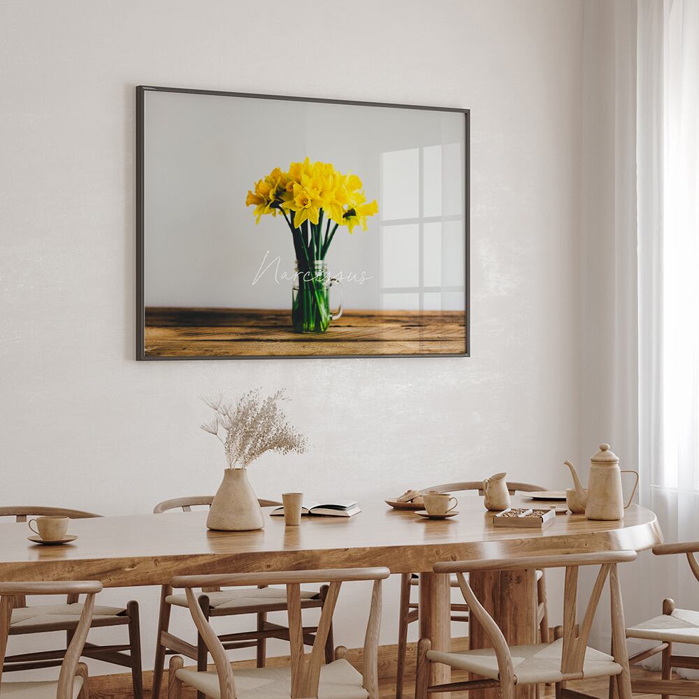 春の花のフォトポスターです。元気がもらえる黄色のミモザや、水仙、ヒヤシンスやラナンキュラスをご用意いたしました。英字を入れて、おしゃれな雰囲気にしてみました。