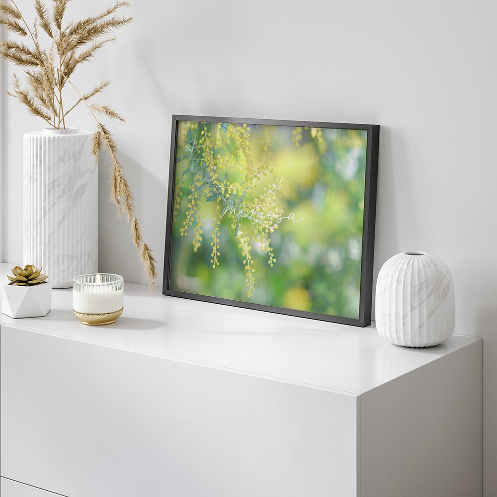 春の花のフォトポスターです。元気がもらえる黄色のミモザや、水仙、ヒヤシンスやラナンキュラスをご用意いたしました。英字を入れて、おしゃれな雰囲気にしてみました。