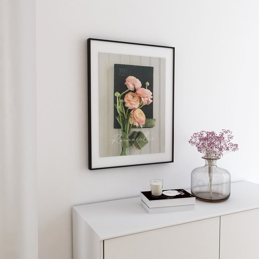 春の花のフォトポスターです。元気がもらえる黄色のミモザや、水仙、ヒヤシンスやラナンキュラスをご用意いたしました。英字を入れて、おしゃれな雰囲気にしてみました。