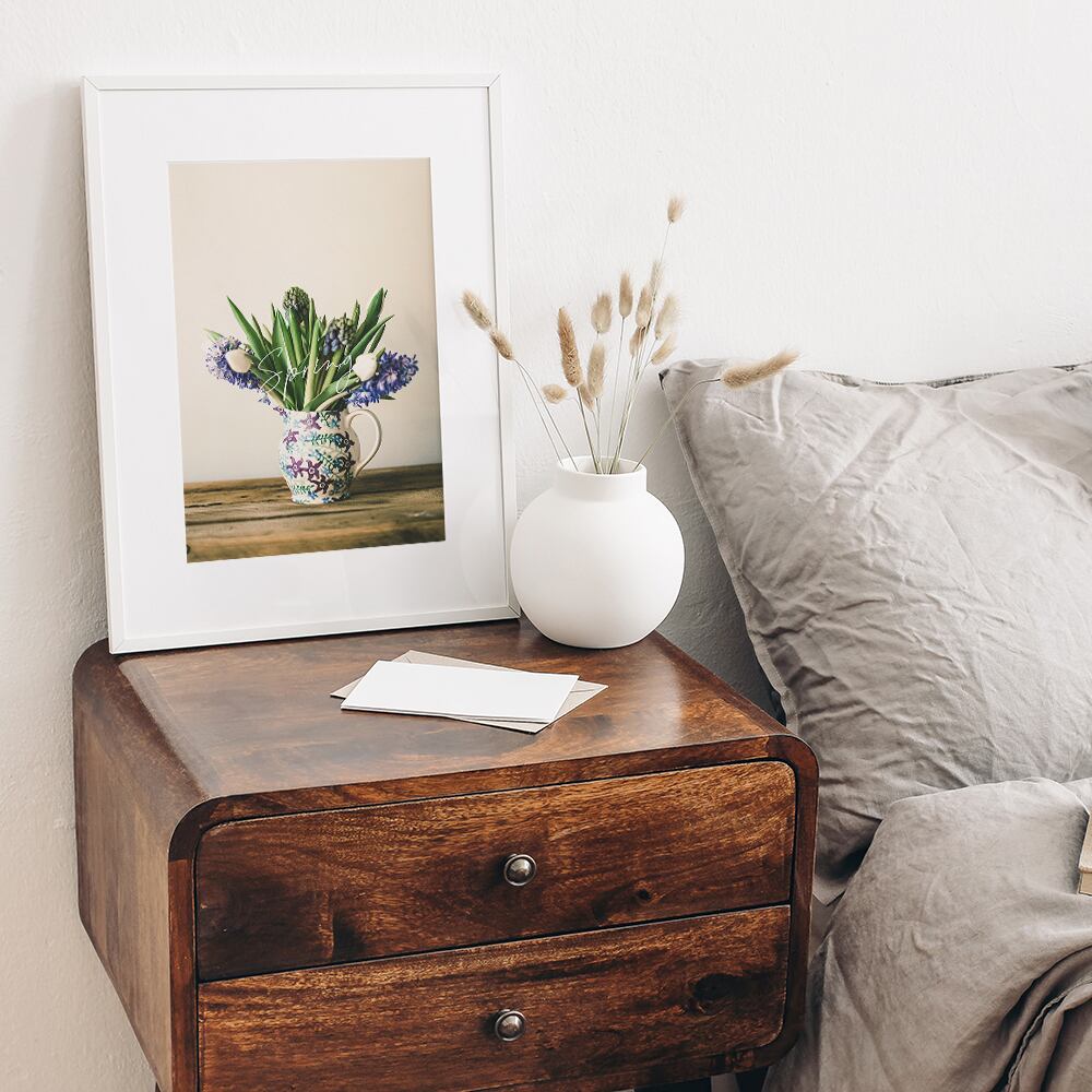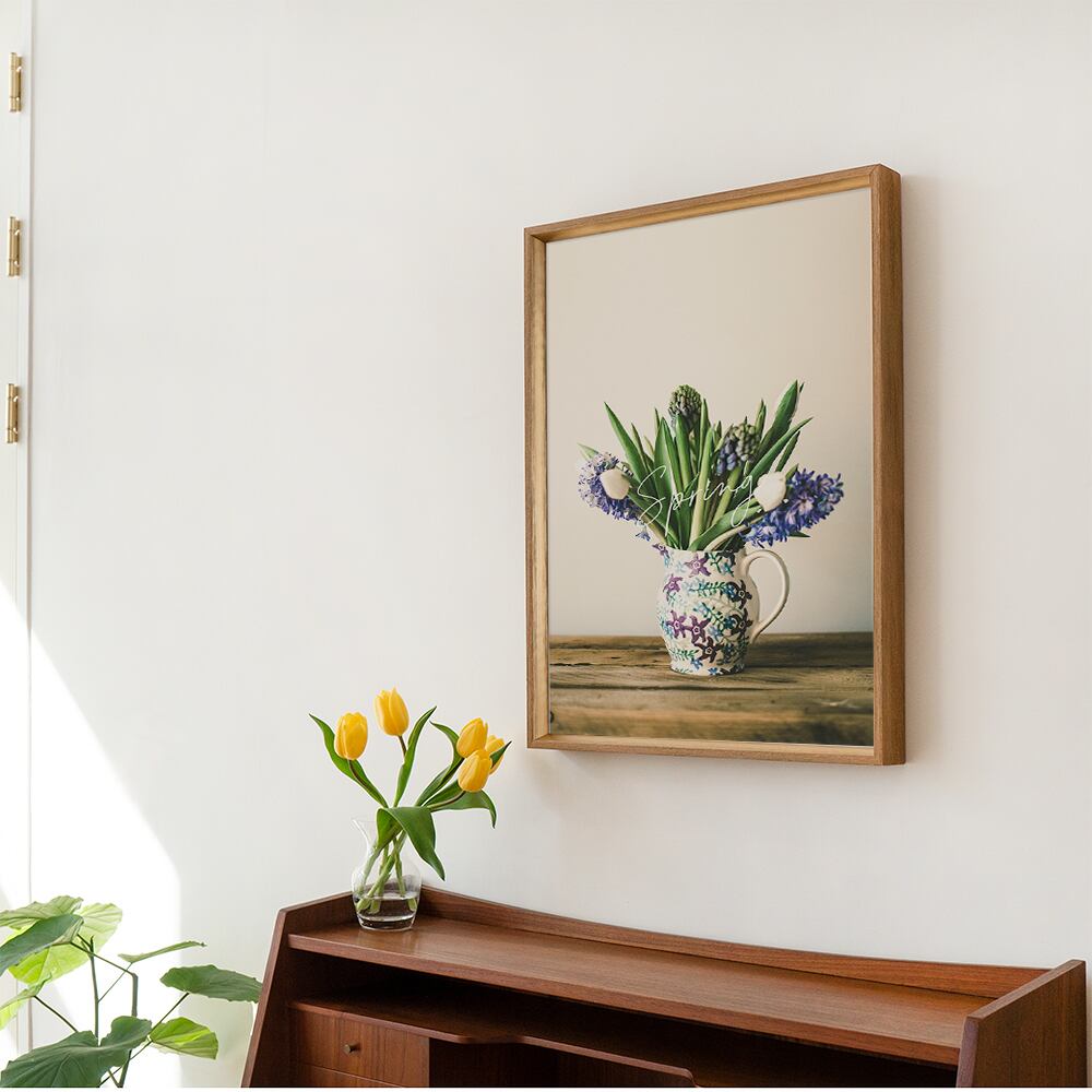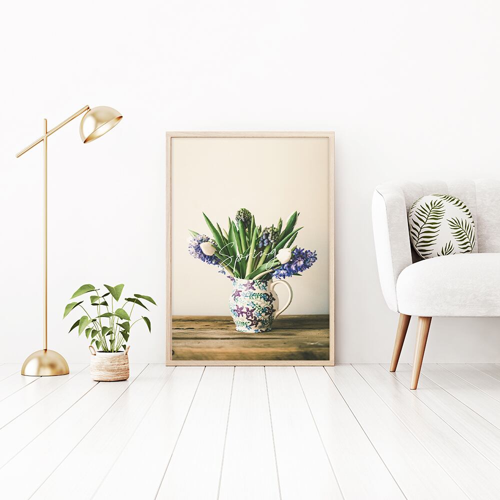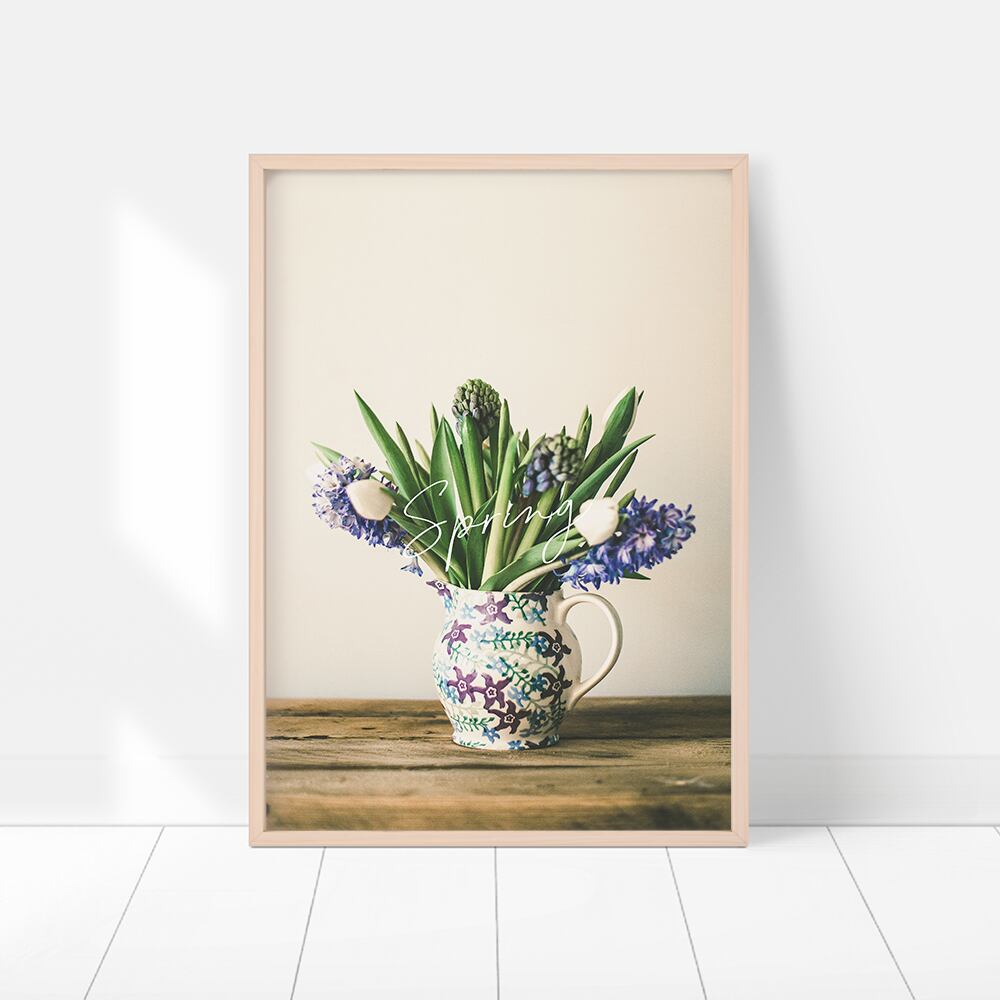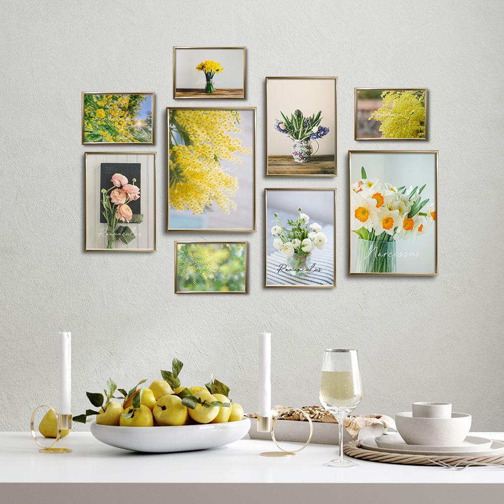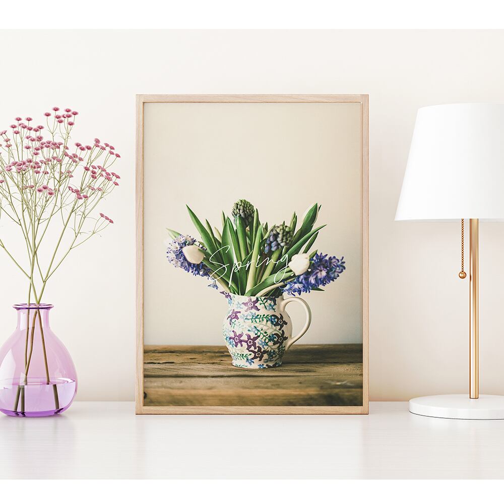 春の花のフォトポスターです。元気がもらえる黄色のミモザや、水仙、ヒヤシンスやラナンキュラスをご用意いたしました。英字を入れて、おしゃれな雰囲気にしてみました。
