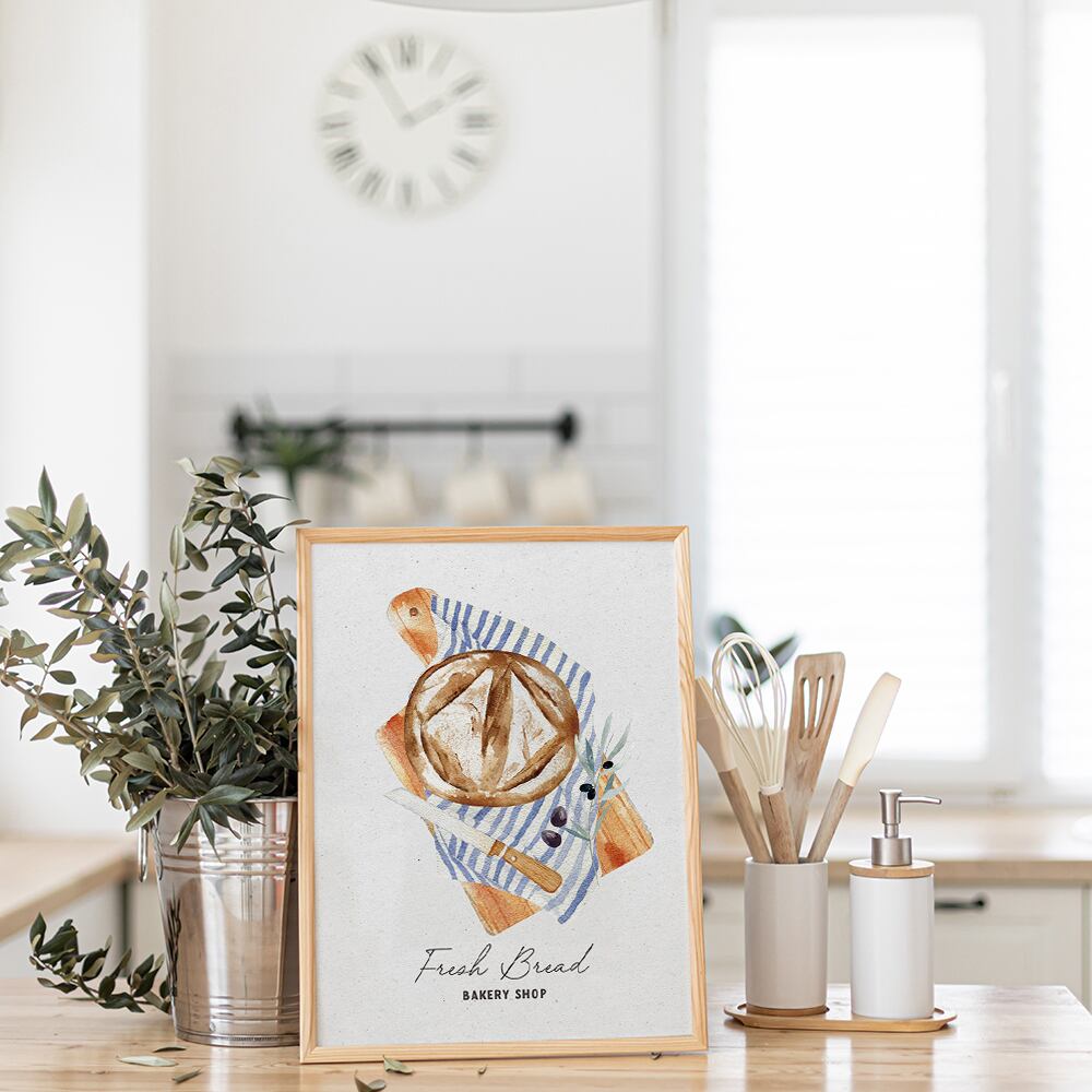 パンを主役にしたポスターです。フランスパンやクロワッサン、カンパーニュや、白パン、デニッシュなど、さまざまなな種類のパンが水彩タッチで描かれています。背景にはオフホワイトからベージュ、ブラウン調のペーパー素材の色を使用し、英字で装飾いたしました。キッチンポスターとして、いかがでしょうか♪