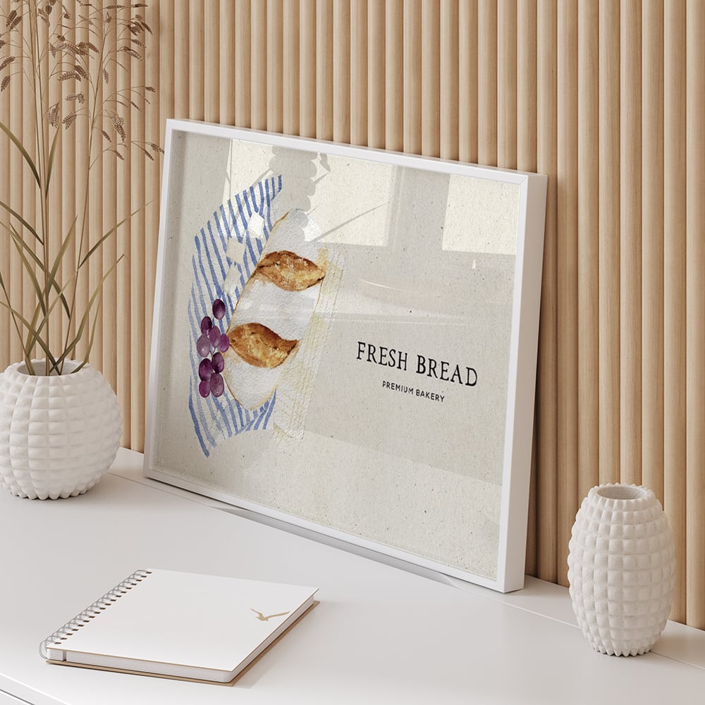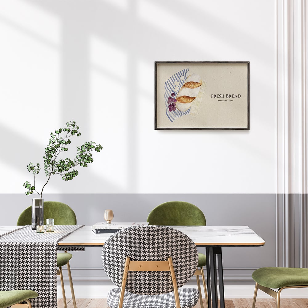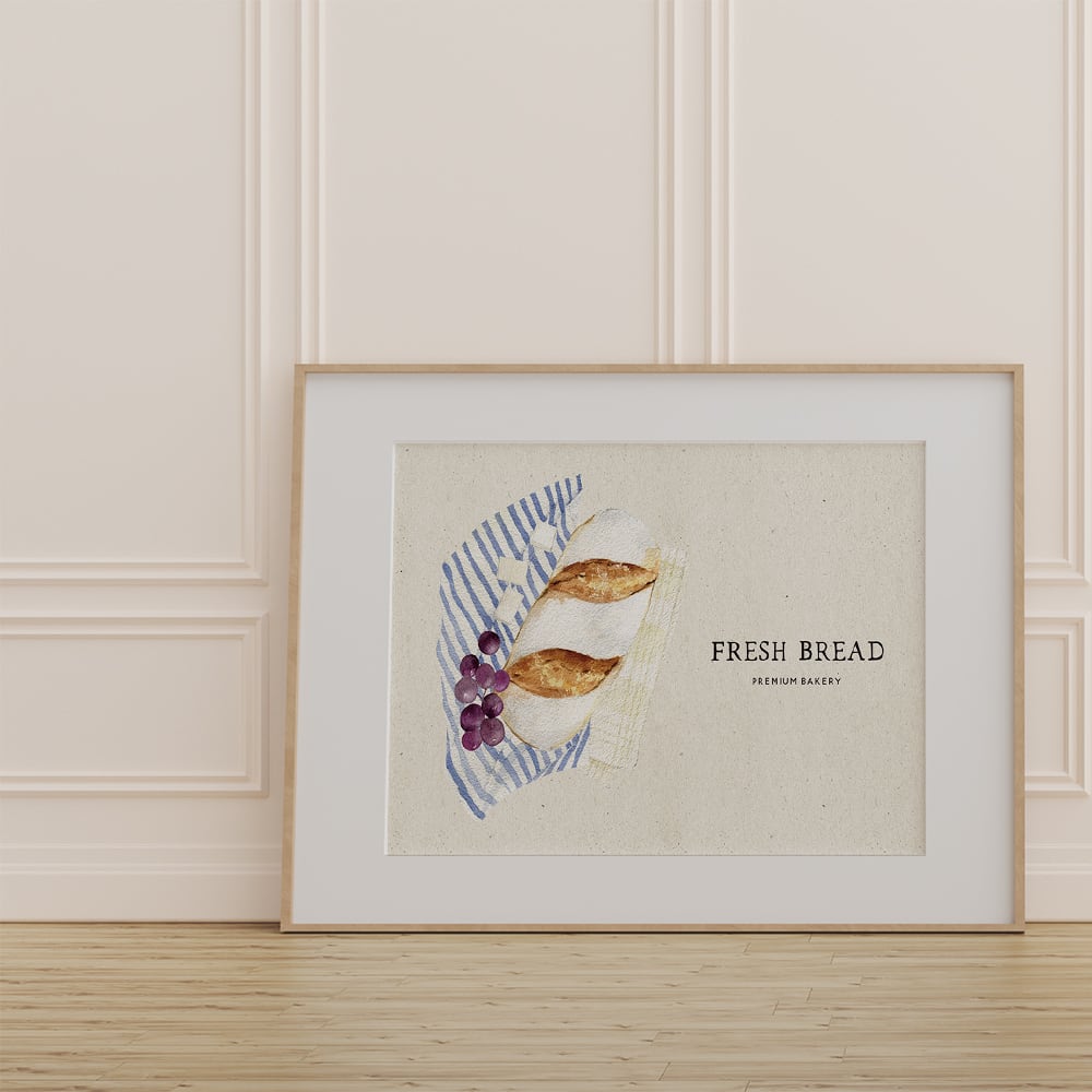 パンを主役にしたポスターです。フランスパンやクロワッサン、カンパーニュや、白パン、デニッシュなど、さまざまなな種類のパンが水彩タッチで描かれています。背景にはオフホワイトからベージュ、ブラウン調のペーパー素材の色を使用し、英字で装飾いたしました。キッチンポスターとして、いかがでしょうか♪