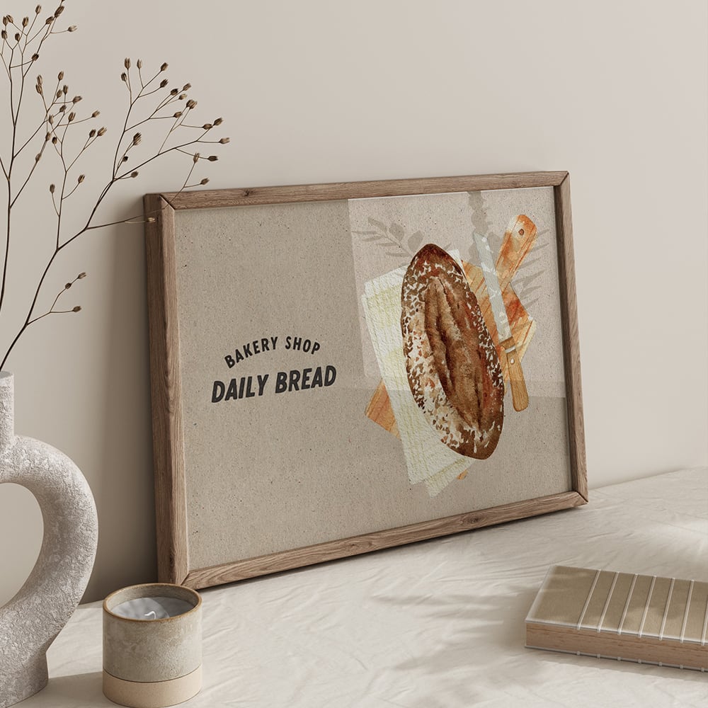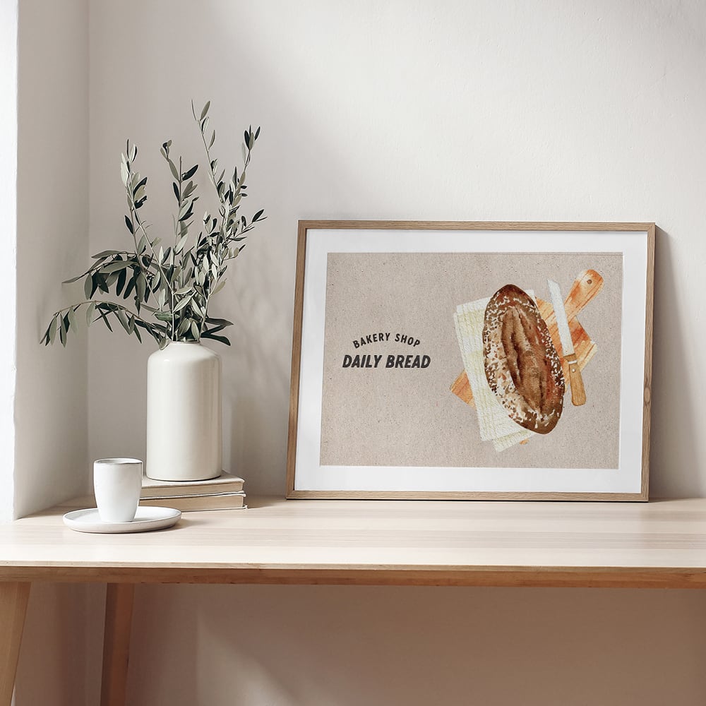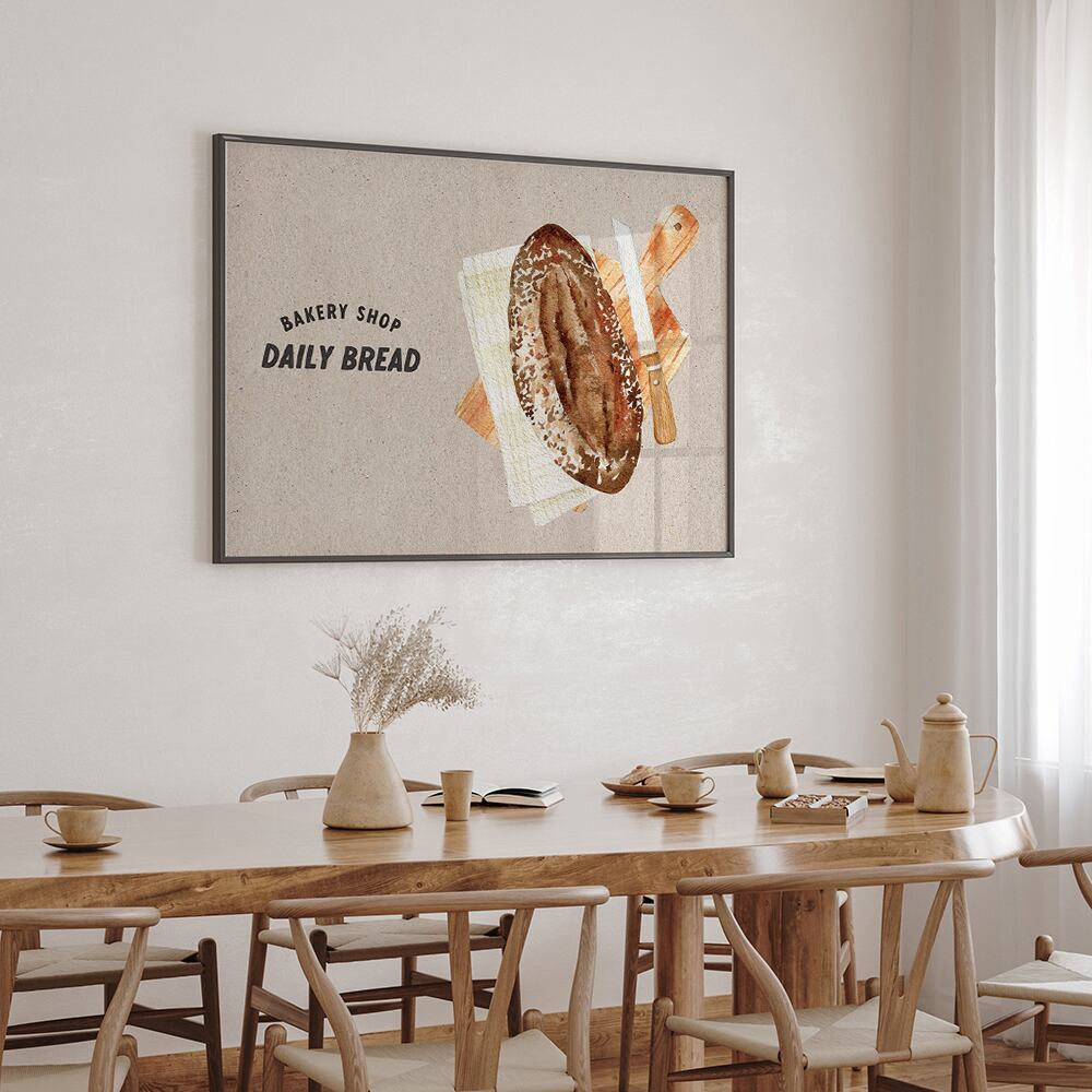パンを主役にしたポスターです。フランスパンやクロワッサン、カンパーニュや、白パン、デニッシュなど、さまざまなな種類のパンが水彩タッチで描かれています。背景にはオフホワイトからベージュ、ブラウン調のペーパー素材の色を使用し、英字で装飾いたしました。キッチンポスターとして、いかがでしょうか♪