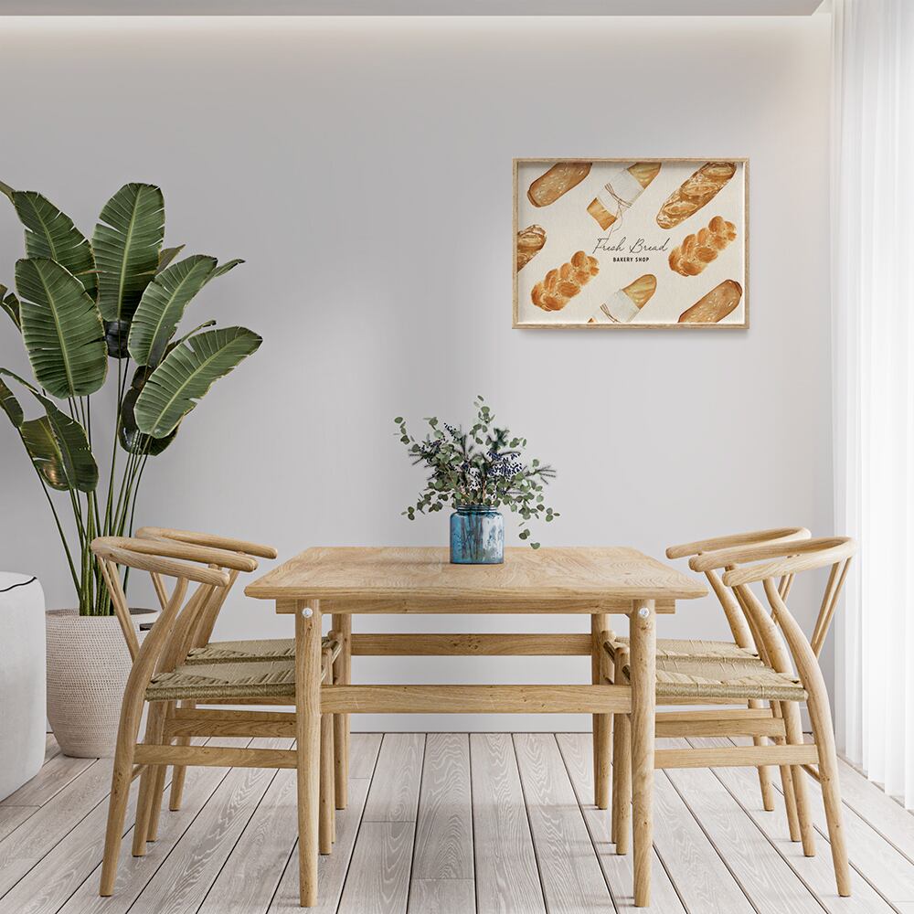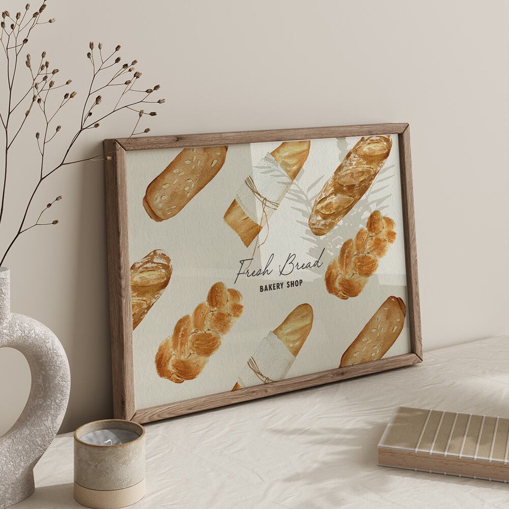 パンを主役にしたポスターです。フランスパンやクロワッサン、カンパーニュや、白パン、デニッシュなど、さまざまなな種類のパンが水彩タッチで描かれています。背景にはオフホワイトからベージュ、ブラウン調のペーパー素材の色を使用し、英字で装飾いたしました。キッチンポスターとして、いかがでしょうか♪