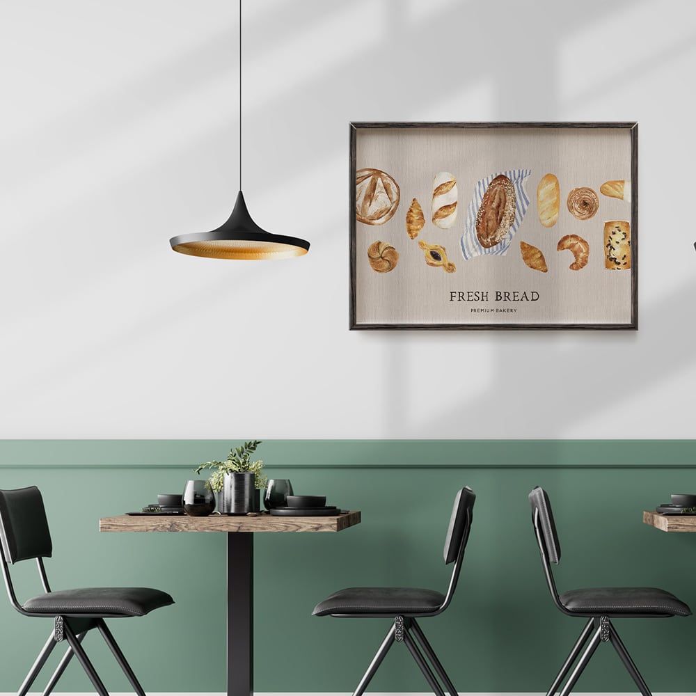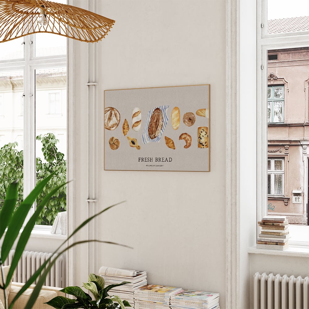 パンを主役にしたポスターです。フランスパンやクロワッサン、カンパーニュや、白パン、デニッシュなど、さまざまなな種類のパンが水彩タッチで描かれています。背景にはオフホワイトからベージュ、ブラウン調のペーパー素材の色を使用し、英字で装飾いたしました。キッチンポスターとして、いかがでしょうか♪
