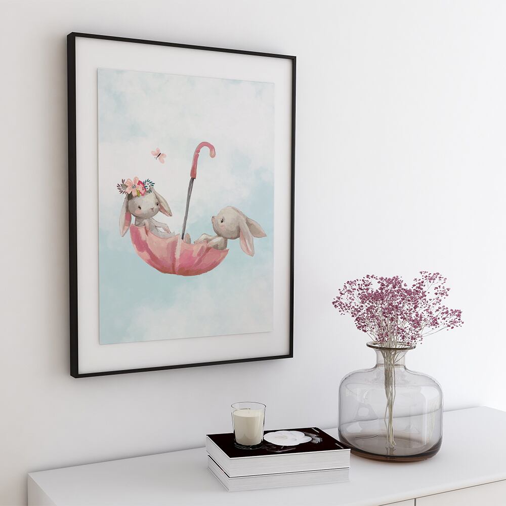 傘で空を舞うウサギたち、うさぎの親子や鹿の親子などの可愛らしい動物たち。絵本から切り取ったような、心温まるシーンのポスターです。子供部屋にいかがでしょうか?