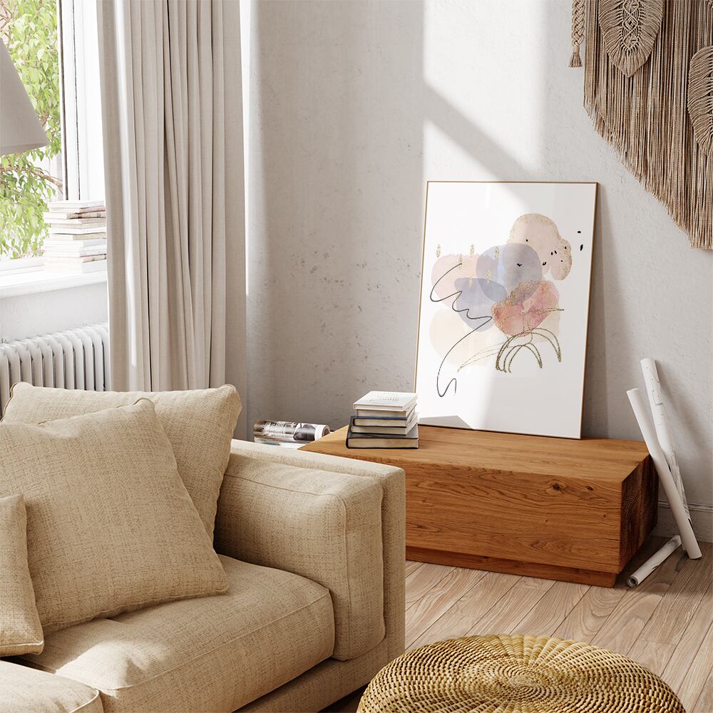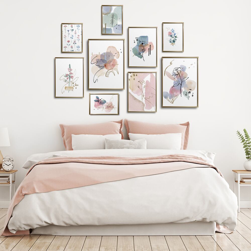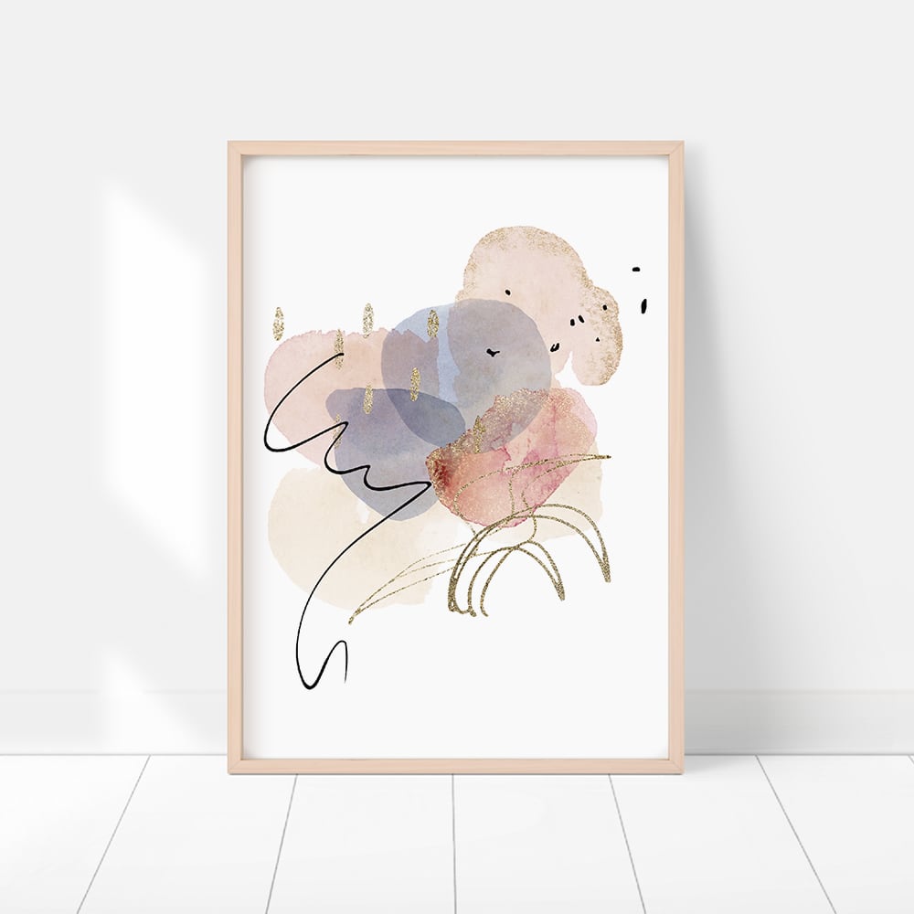 ピンクや水色、青、緑などの水彩模様に、シンプルな線の花や、動きのあるラインなどを合わせたポスターです。カラフルで優しいタッチが特徴です。大人可愛い雰囲気が好きな方にオススメです♪