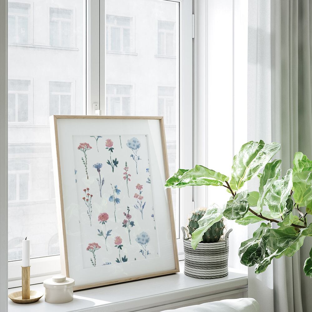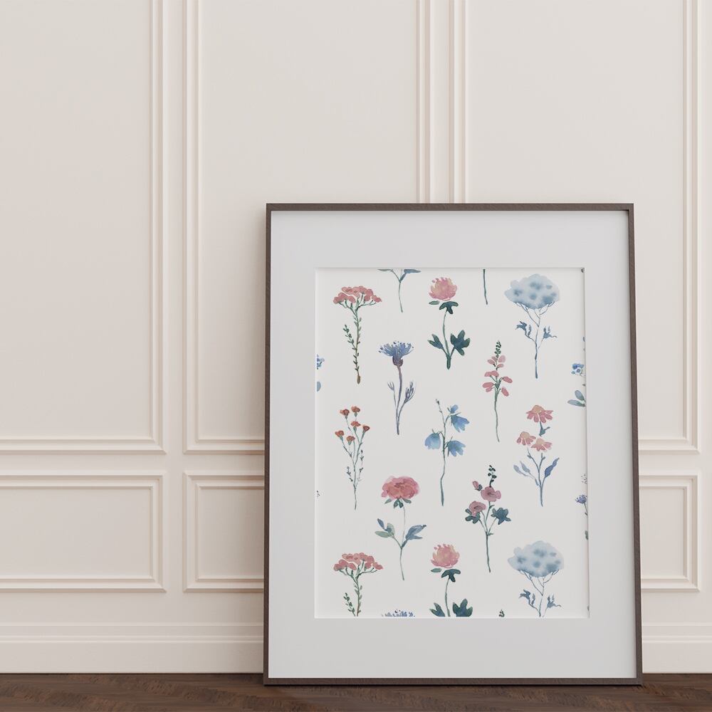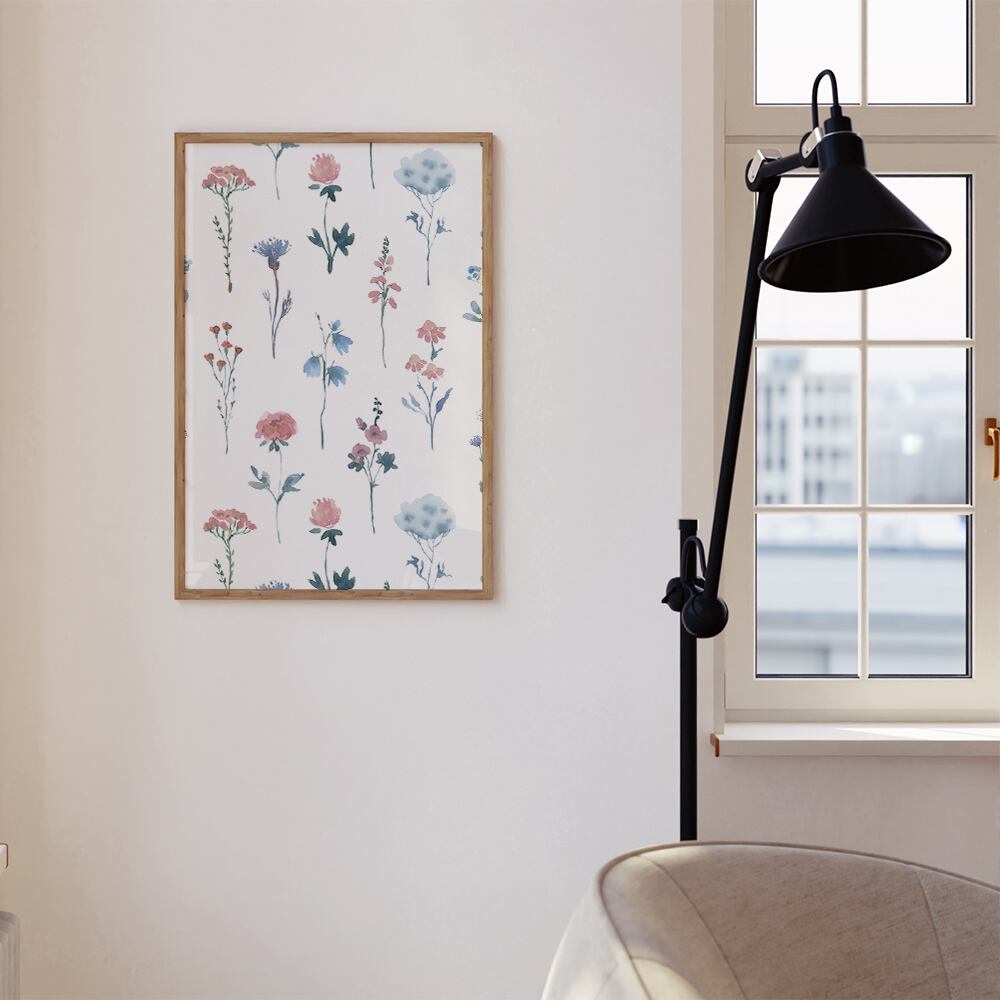 ピンクや水色、青、緑などの水彩模様に、シンプルな線の花や、動きのあるラインなどを合わせたポスターです。カラフルで優しいタッチが特徴です。大人可愛い雰囲気が好きな方にオススメです♪