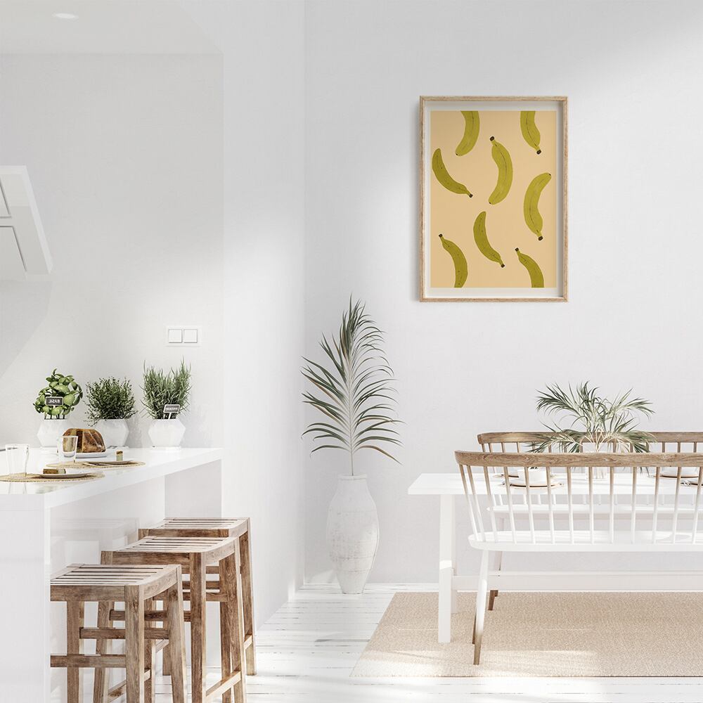 レモン、アボカド、バナナ、ロブスター、洋梨などの食べ物をモチーフにしたモダンアートです。
