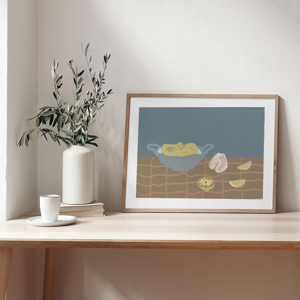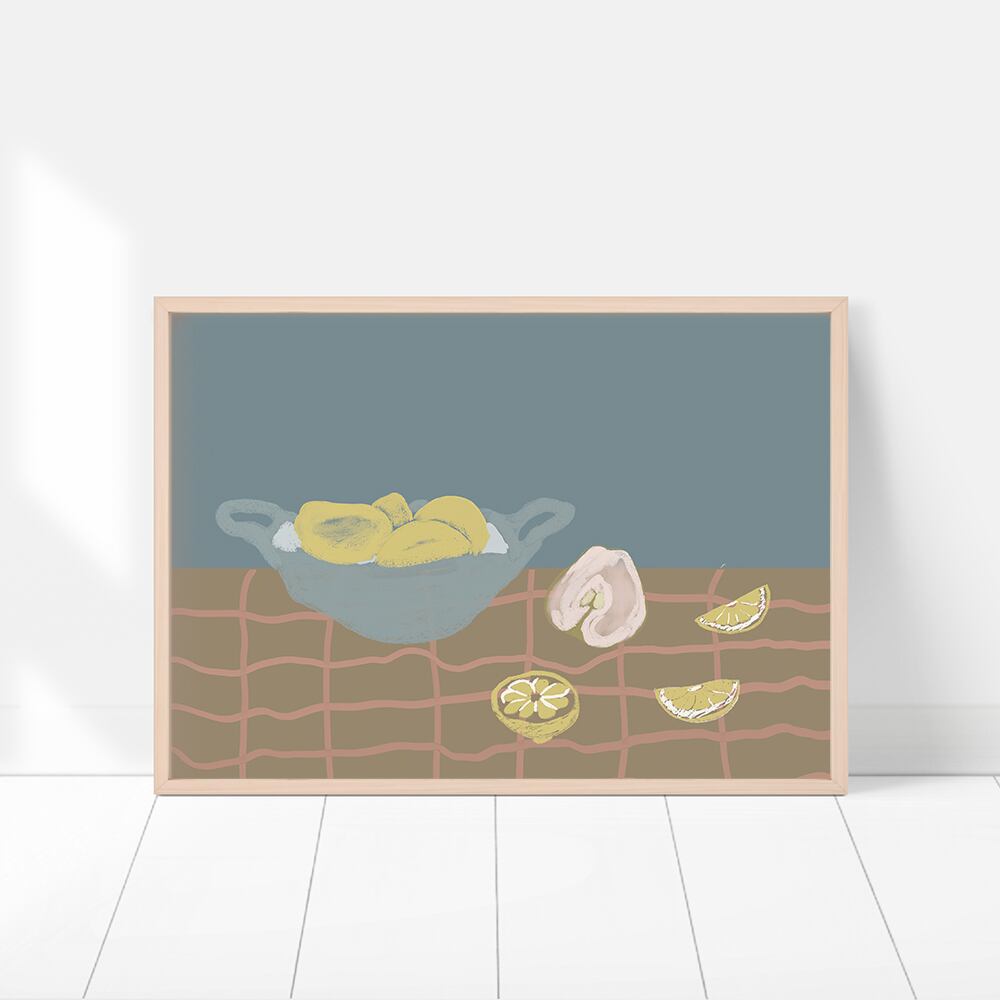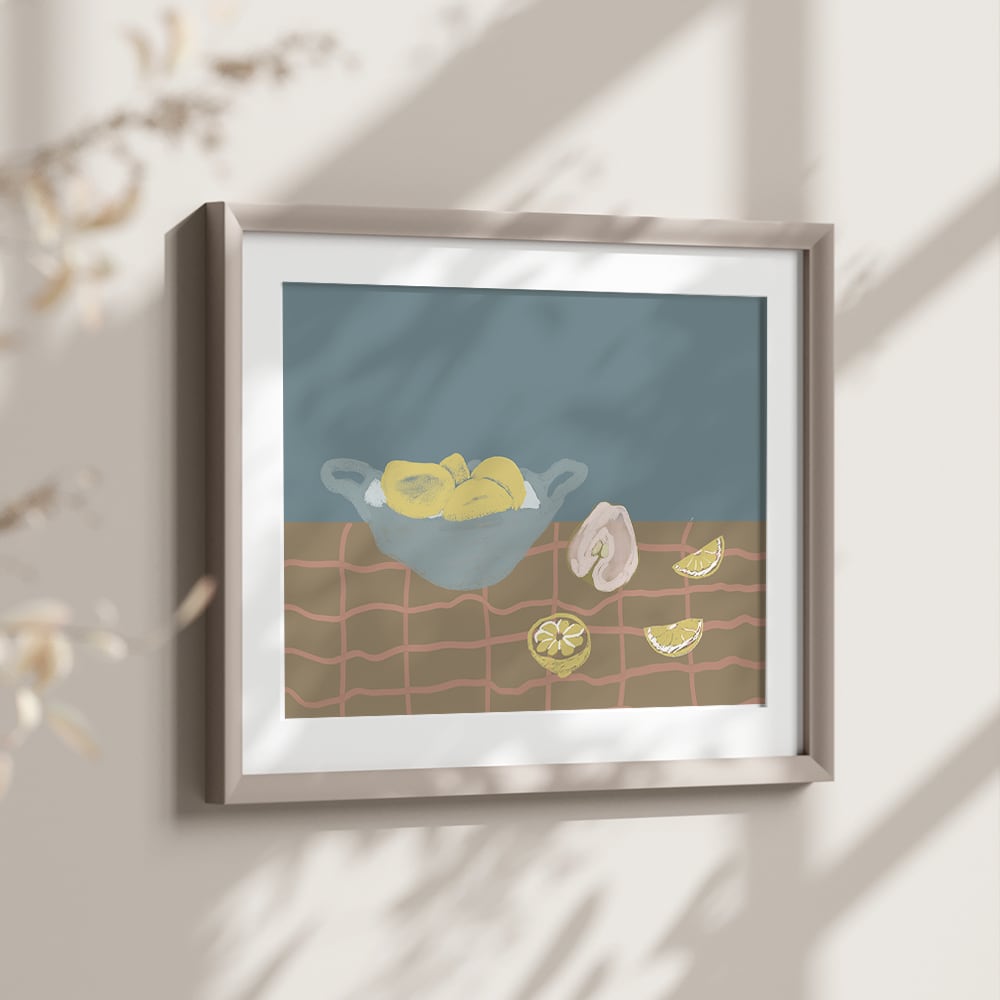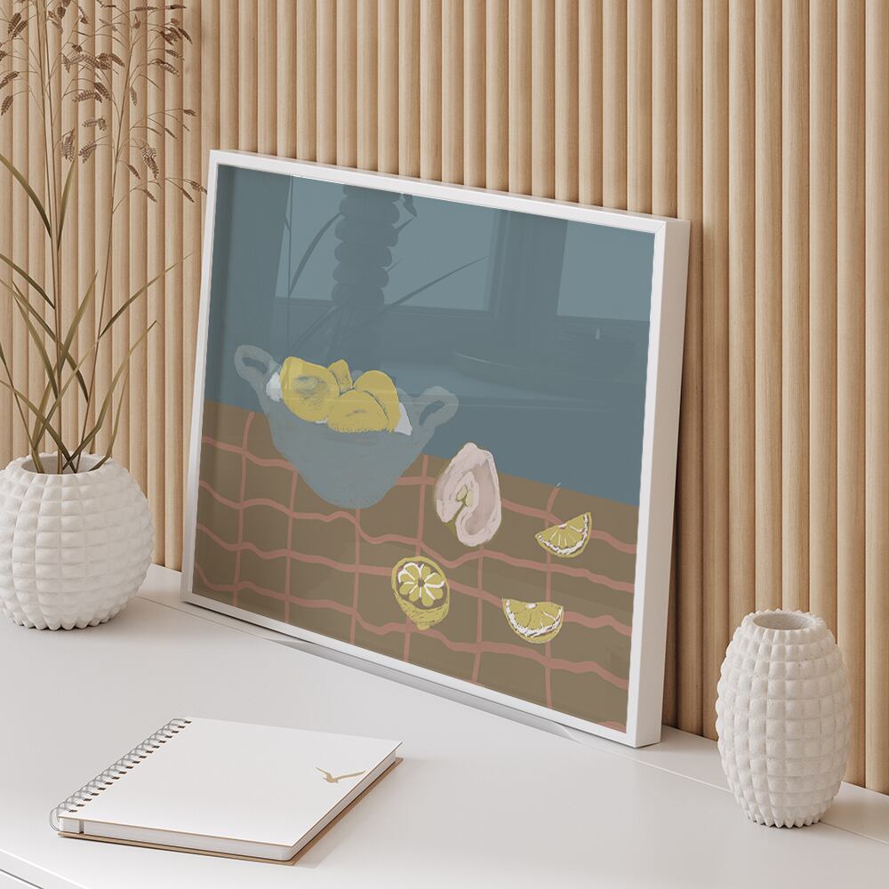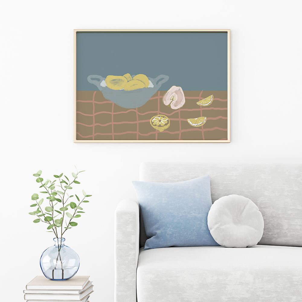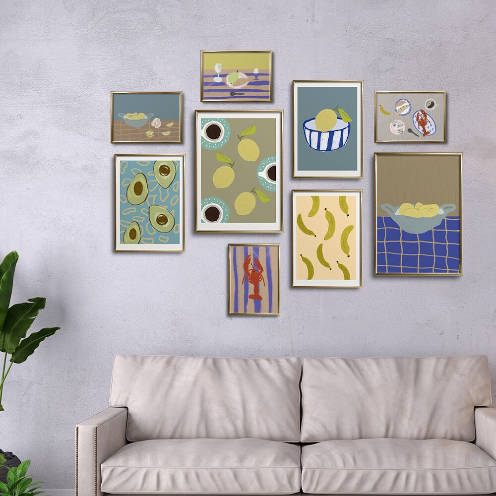 レモン、アボカド、バナナ、ロブスター、洋梨などの食べ物をモチーフにしたモダンアートです。