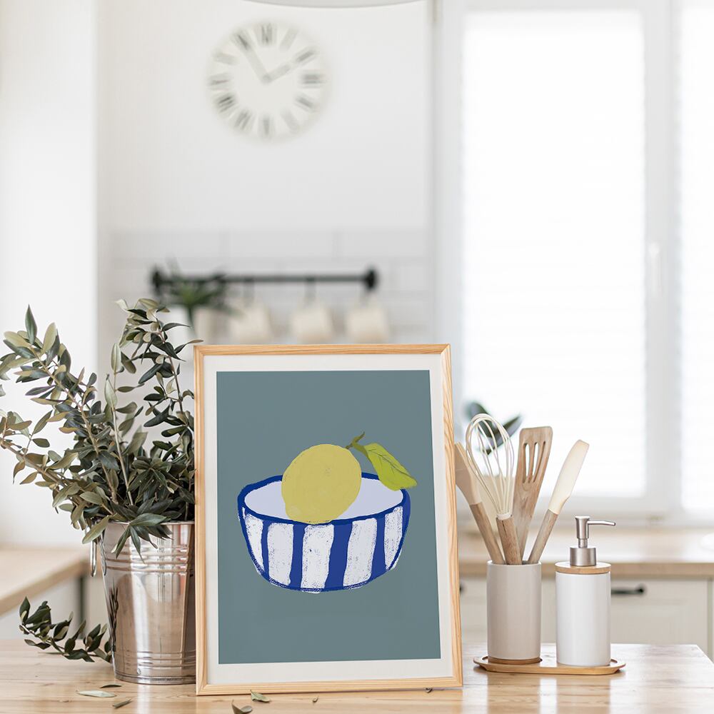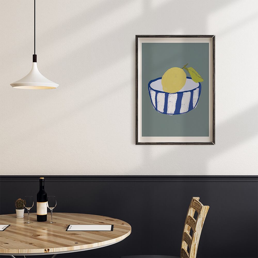 レモン、アボカド、バナナ、ロブスター、洋梨などの食べ物をモチーフにしたモダンアートです。