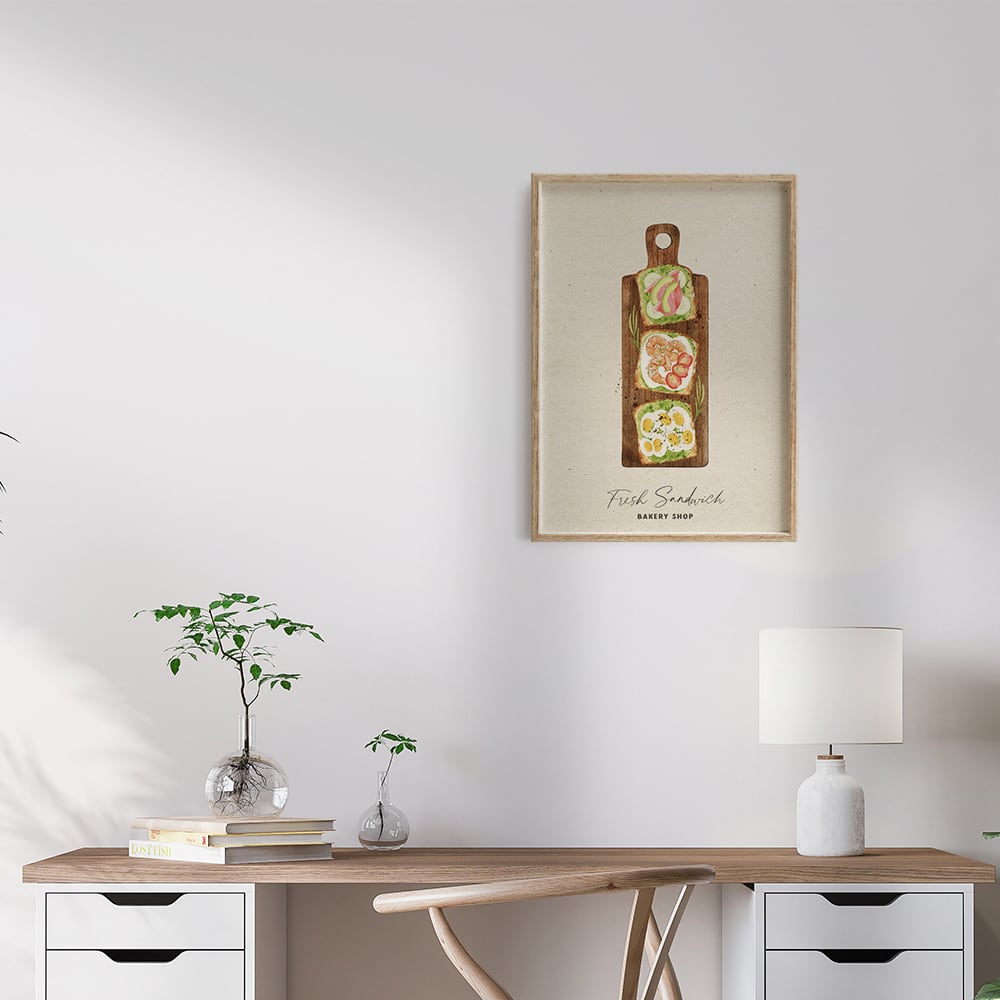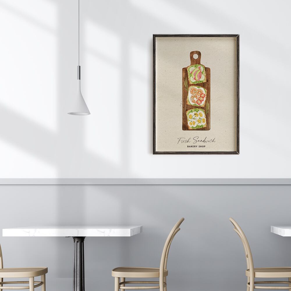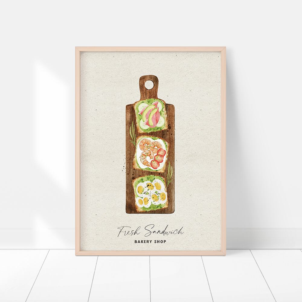 トマトやレタス、タマゴ、アボカド、エビなどの具材がたっぷり乗った、サンドイッチのポスターです。背景はナチュラルな紙素材を使って、カジュアルな英字で飾ってみました。キッチンポスターとして、いかがでしょうか。