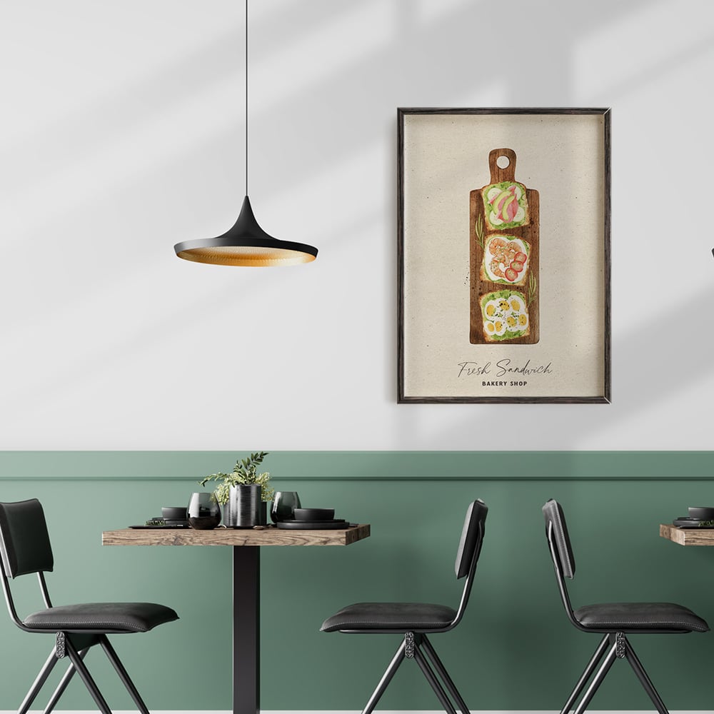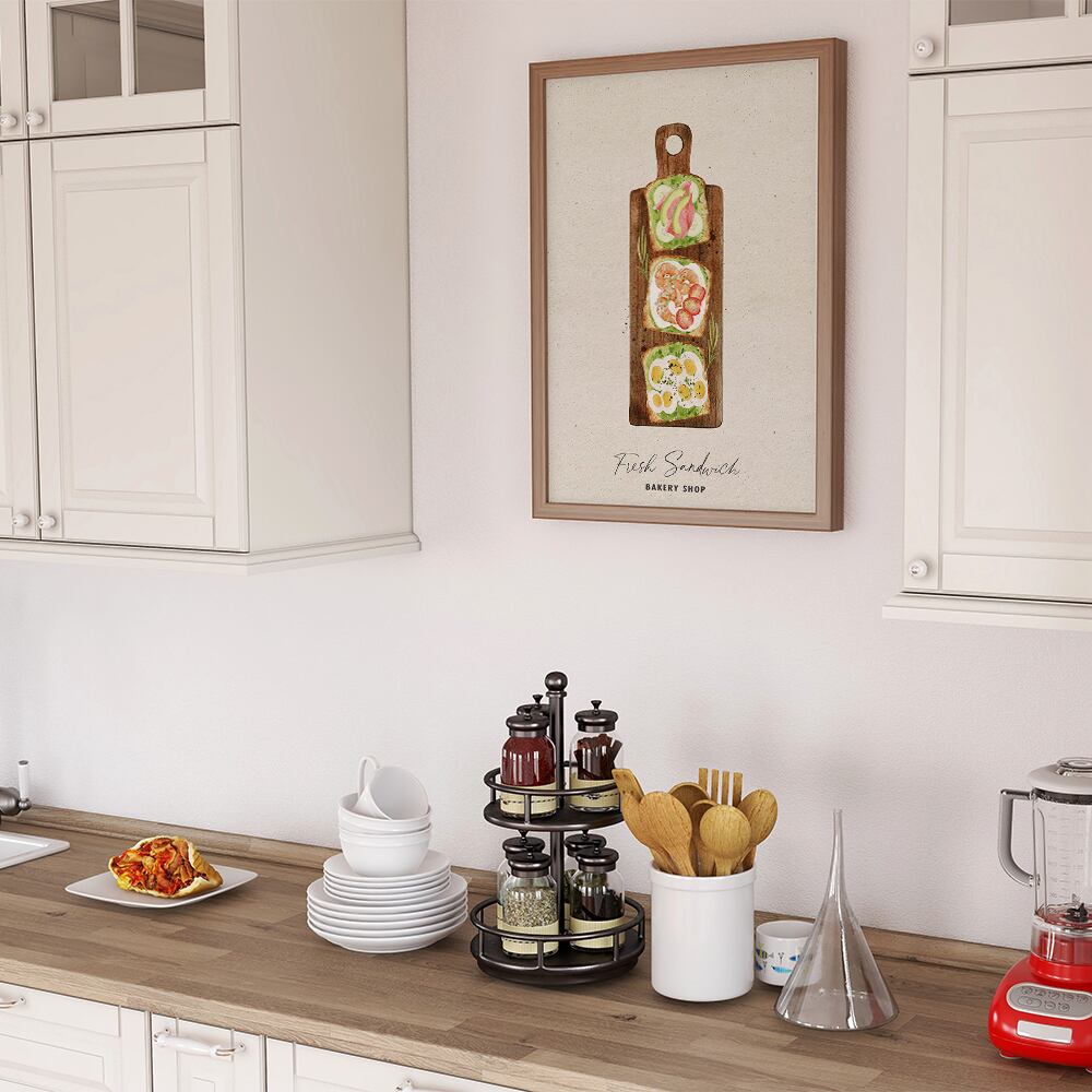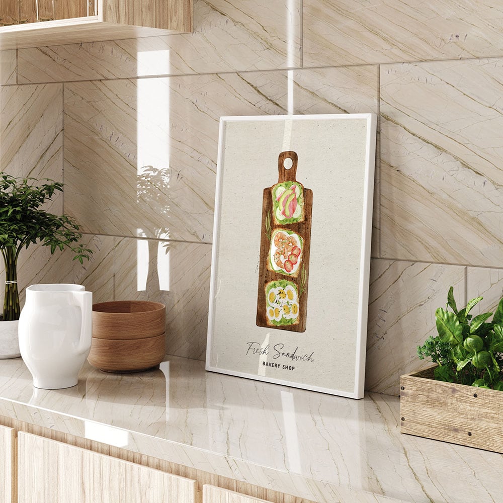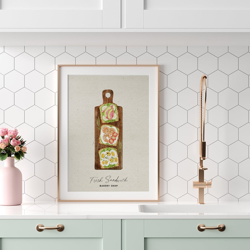 トマトやレタス、タマゴ、アボカド、エビなどの具材がたっぷり乗った、サンドイッチのポスターです。背景はナチュラルな紙素材を使って、カジュアルな英字で飾ってみました。キッチンポスターとして、いかがでしょうか。