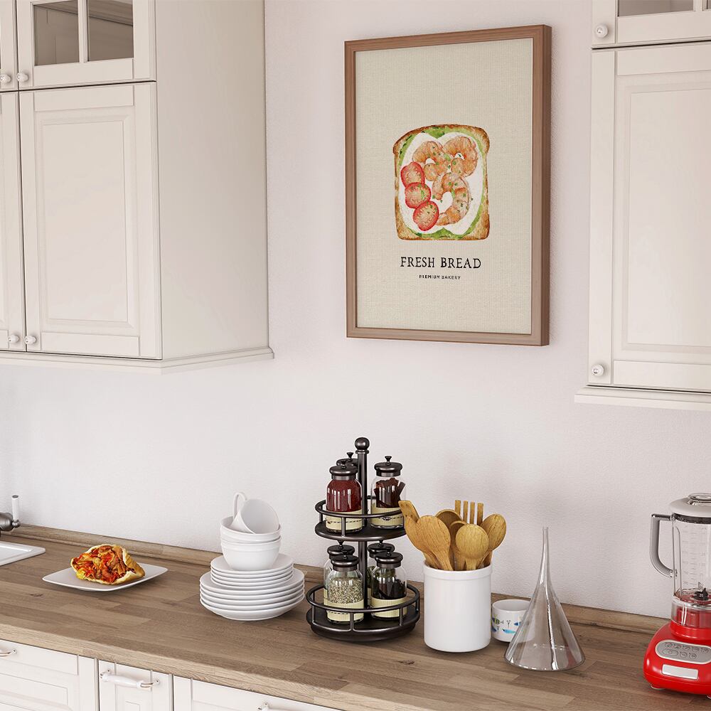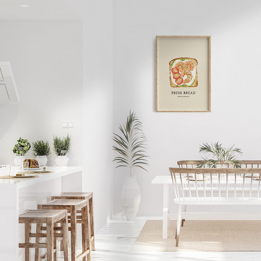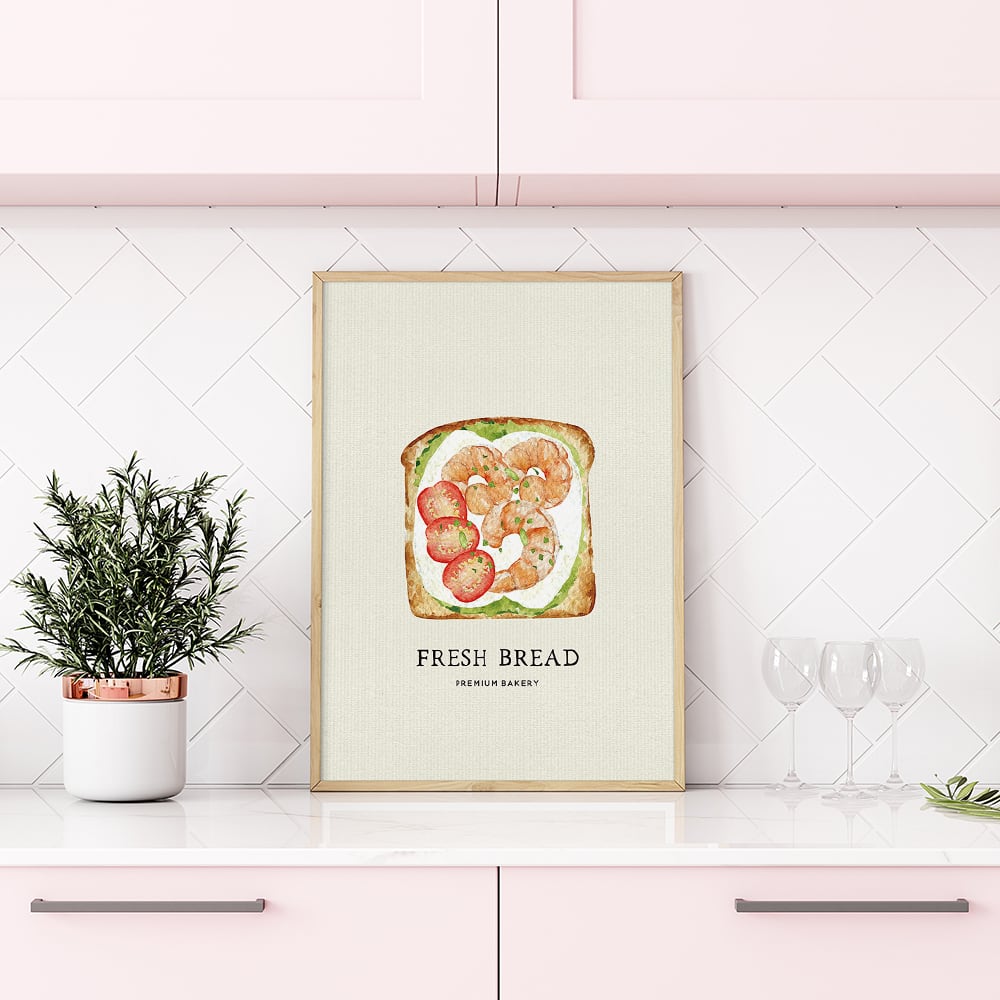 トマトやレタス、タマゴ、アボカド、エビなどの具材がたっぷり乗った、サンドイッチのポスターです。背景はナチュラルな紙素材を使って、カジュアルな英字で飾ってみました。キッチンポスターとして、いかがでしょうか。