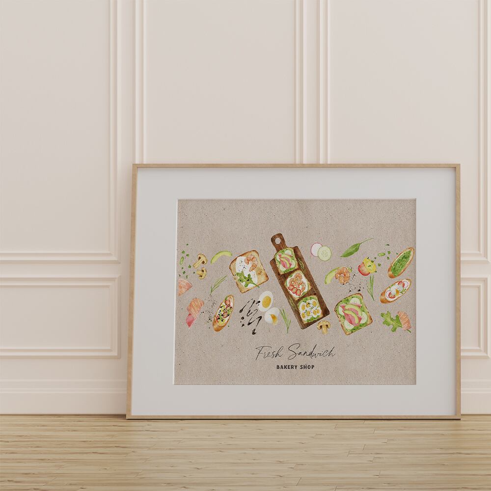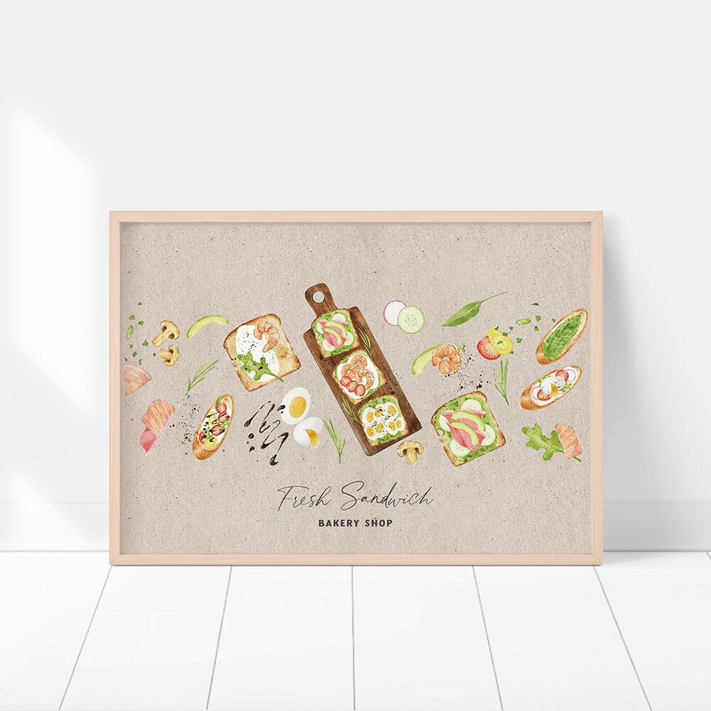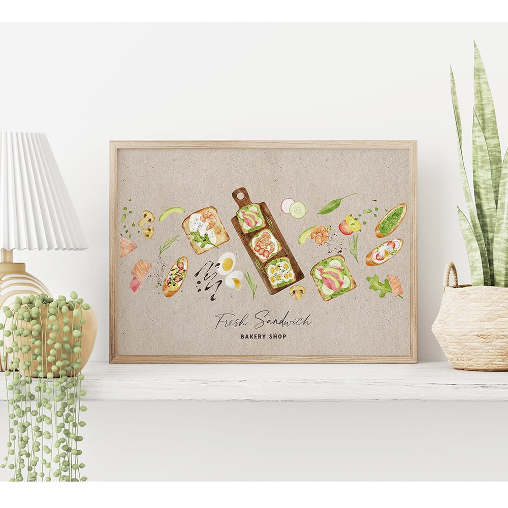 トマトやレタス、タマゴ、アボカド、エビなどの具材がたっぷり乗った、サンドイッチのポスターです。背景はナチュラルな紙素材を使って、カジュアルな英字で飾ってみました。キッチンポスターとして、いかがでしょうか。