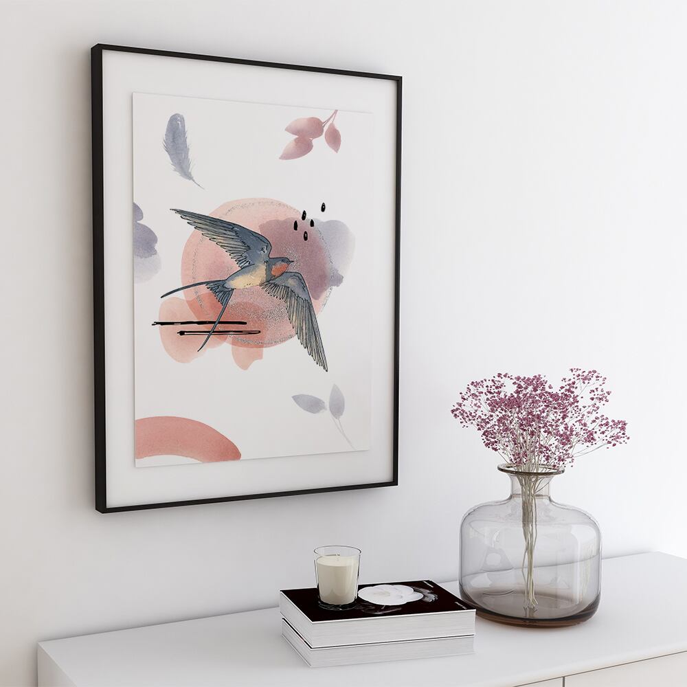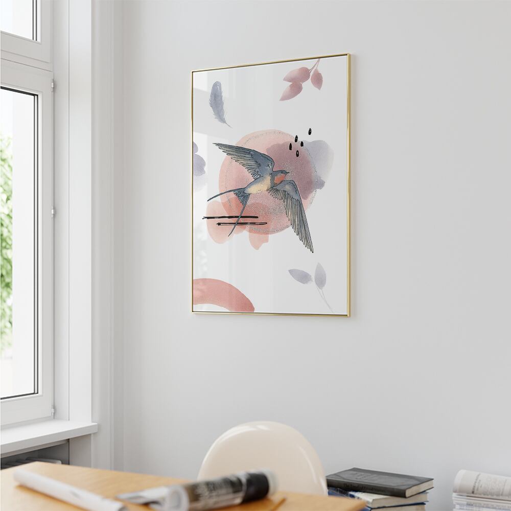 ツバメのポスター / i1341 / 花や音符の水彩画の背景につばめが飛ぶ様子 インテリアポスター