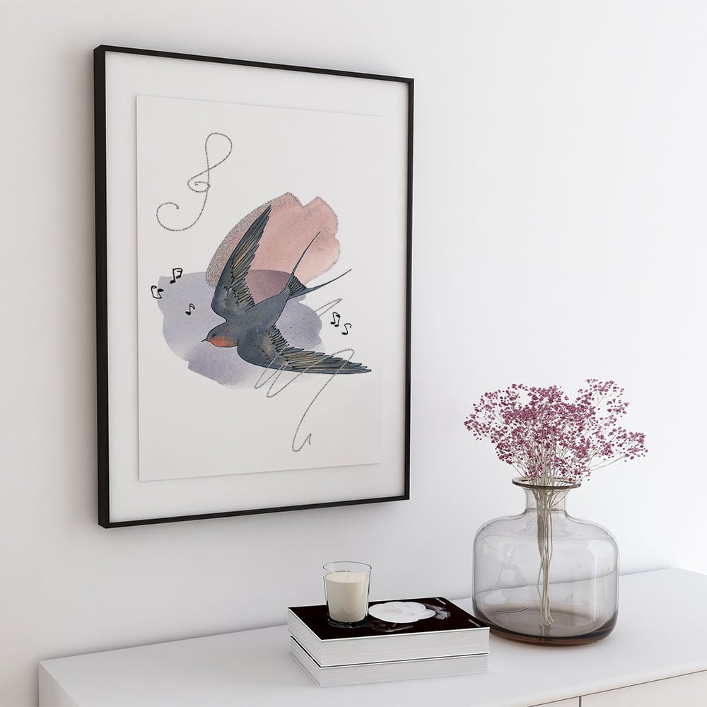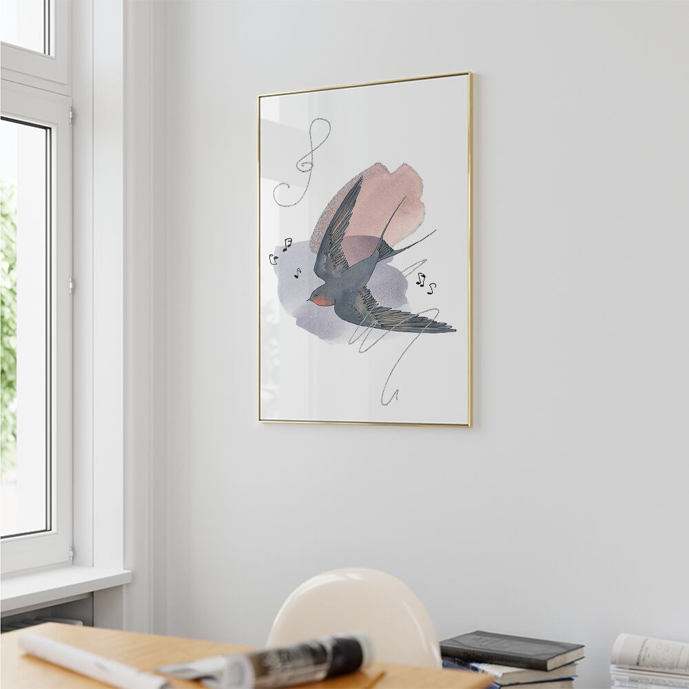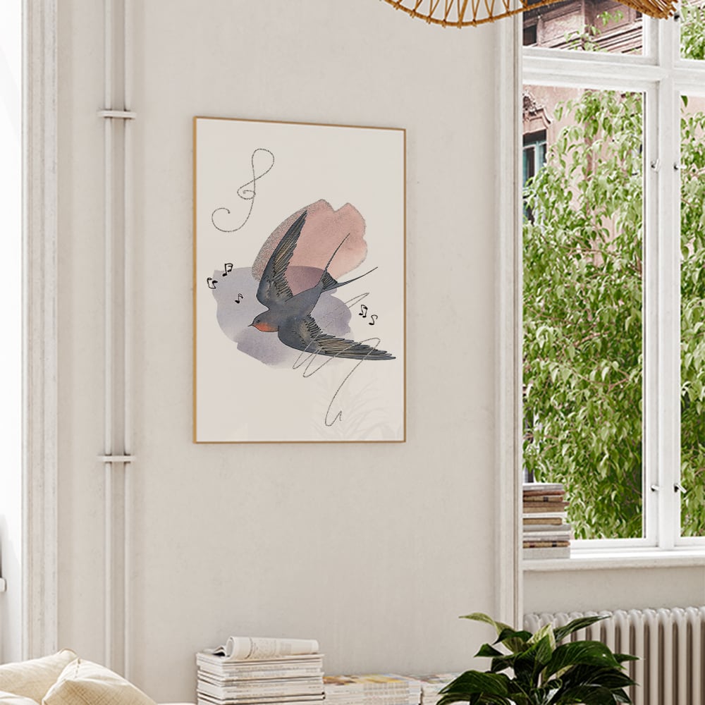 ツバメのポスター / i1342 / 花や音符の水彩画の背景につばめが飛ぶ様子 インテリアポスター