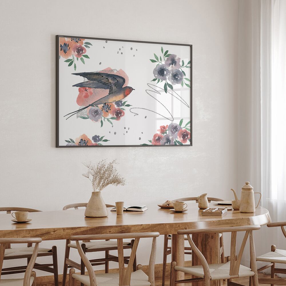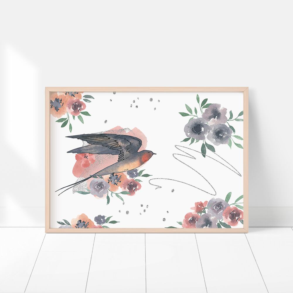 ツバメのポスター / i1345 / 花や音符の水彩画の背景につばめが飛ぶ様子 インテリアポスター