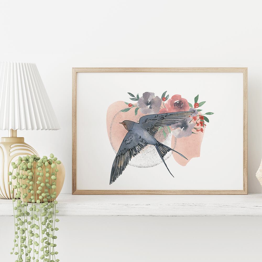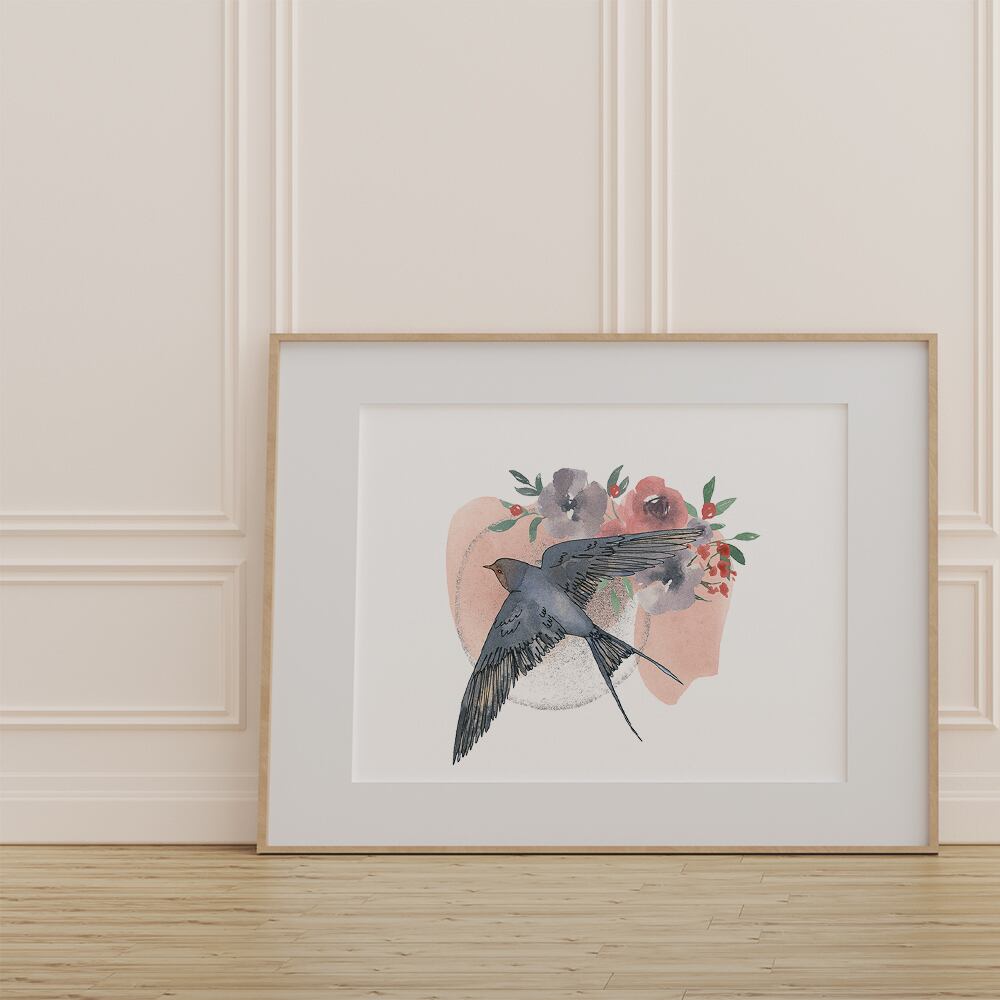 ツバメが勢いよく空を飛ぶ季節になりましたね。ツバメは幸せを運んで来てくれる、幸運の鳥と言われているのだそう。花や音符の水彩画を背景にして、優しく可愛らしい印象に仕上げました。