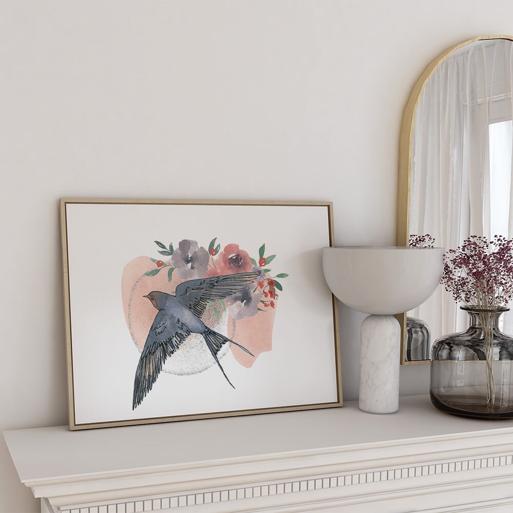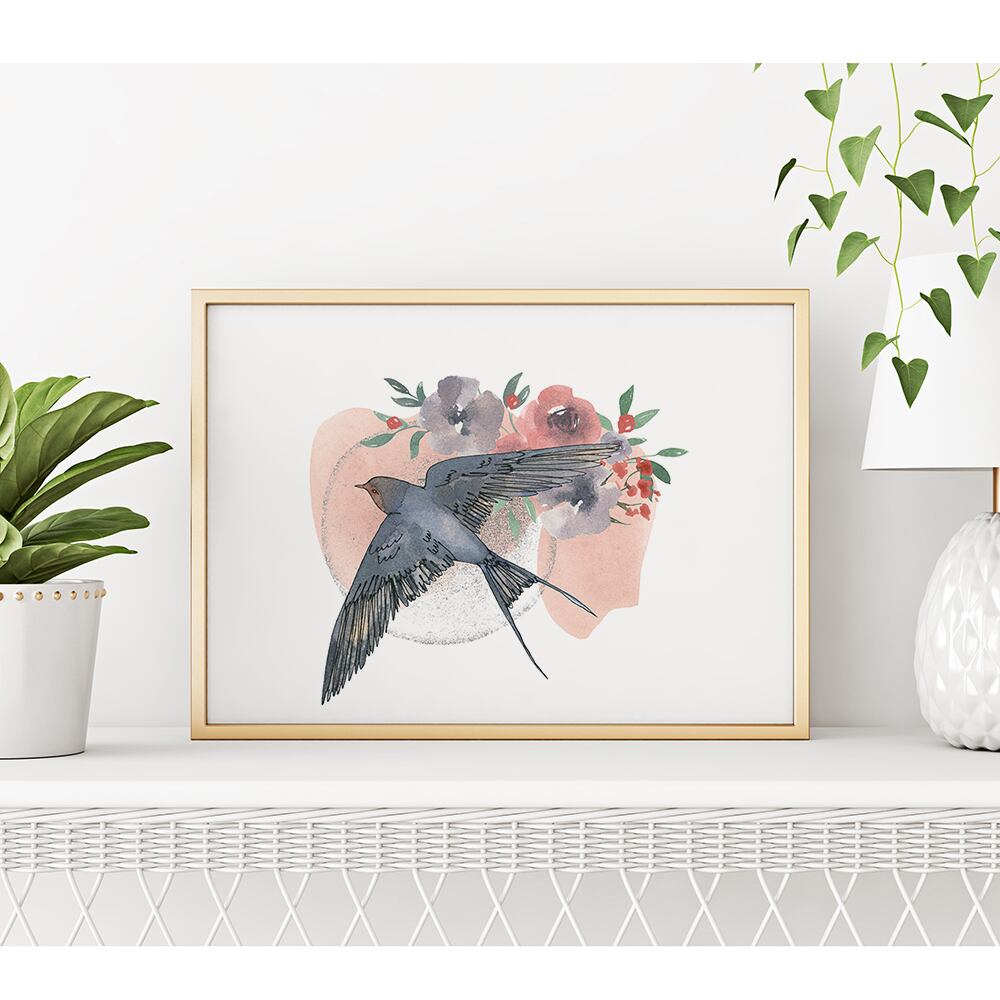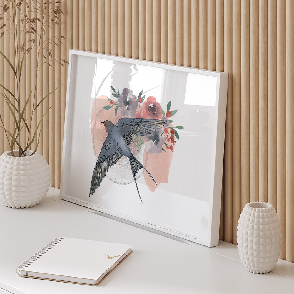 ツバメのポスター / i1346 / 花や音符の水彩画の背景につばめが飛ぶ様子 インテリアポスター