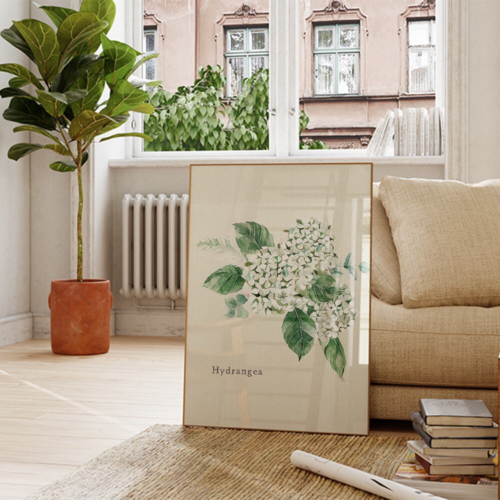 ピンク色のイングリッシュローズと、少し青みがかった紫陽花、コットンフラワーのポスターです。優しく涼しげな色合いです。ブーケやリースなどありますので、お好みでお選びいただけたらと思います♪