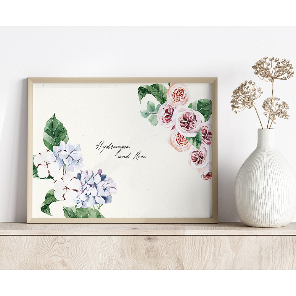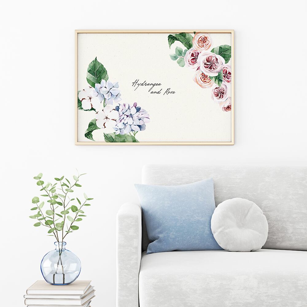 ピンク色のイングリッシュローズと、少し青みがかった紫陽花、コットンフラワーのポスターです。優しく涼しげな色合いです。ブーケやリースなどありますので、お好みでお選びいただけたらと思います♪