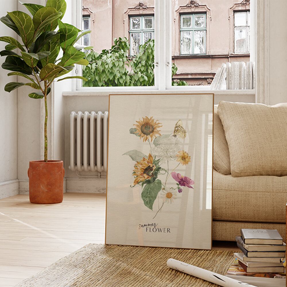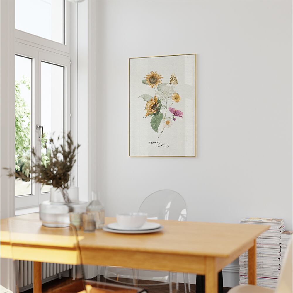夏に向けて、ひまわりのポスターをご用意しました!ひまわりにあじさい、小花をモチーフに、花束やリース状に仕上がっています。控えめな英字を使ったり、背景にもナチュラルな素材を利用したりして、大人可愛いひまわりポスターになっていると思います♪