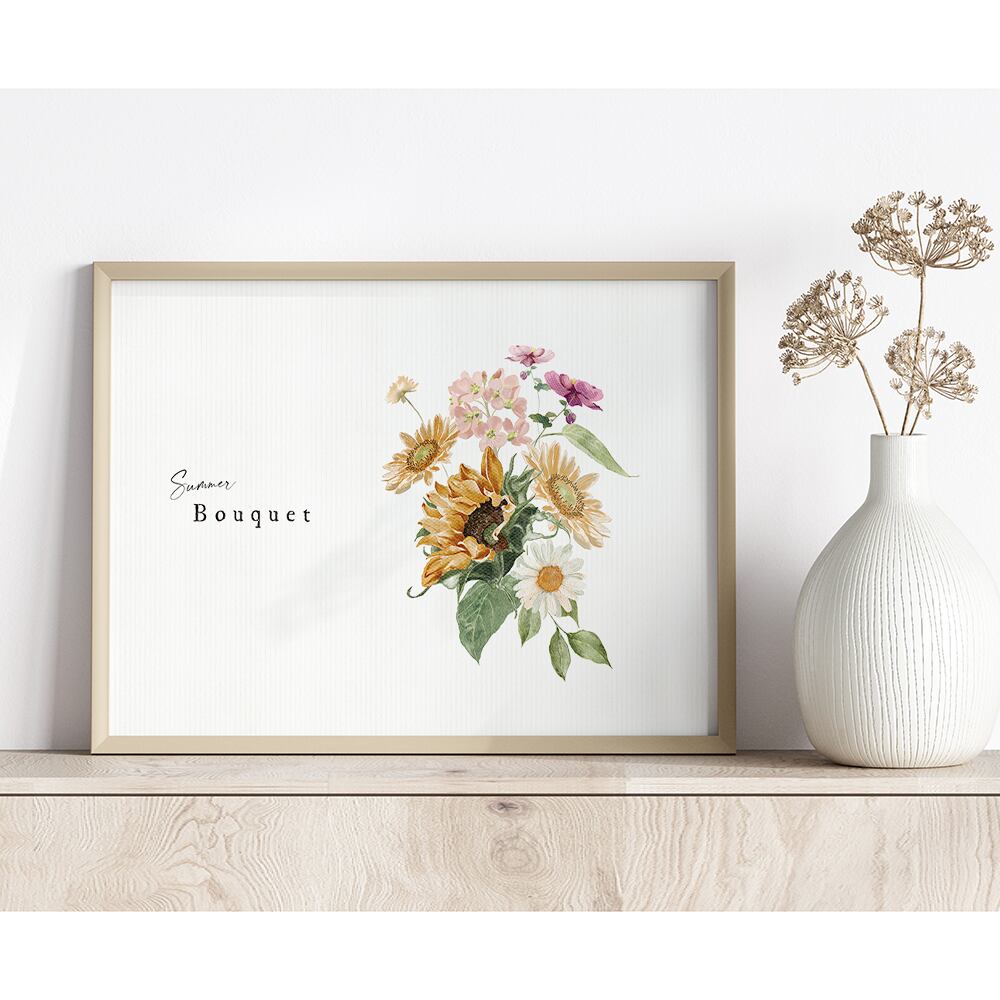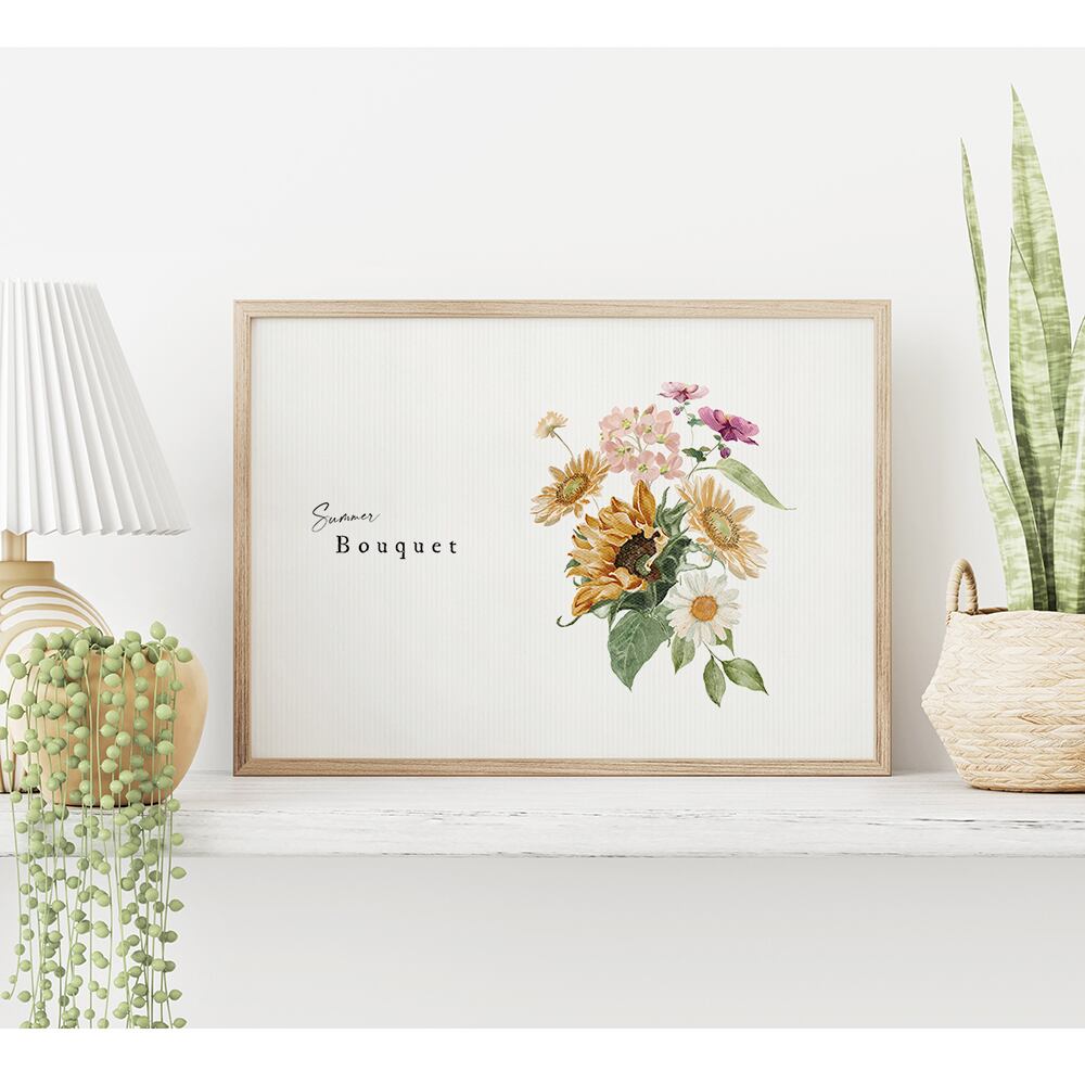 夏に向けて、ひまわりのポスターをご用意しました!ひまわりにあじさい、小花をモチーフに、花束やリース状に仕上がっています。控えめな英字を使ったり、背景にもナチュラルな素材を利用したりして、大人可愛いひまわりポスターになっていると思います♪