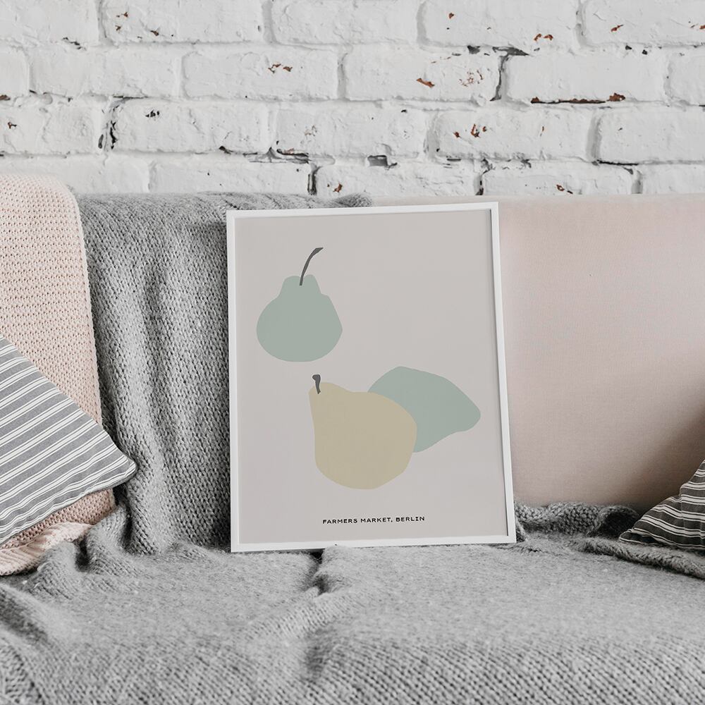 女性や、葉っぱや花、アボカド、洋梨、レモンなど夏らしいモチーフを使ったアートポスターです。淡いトーンのくすんだ色合いで仕上げています。