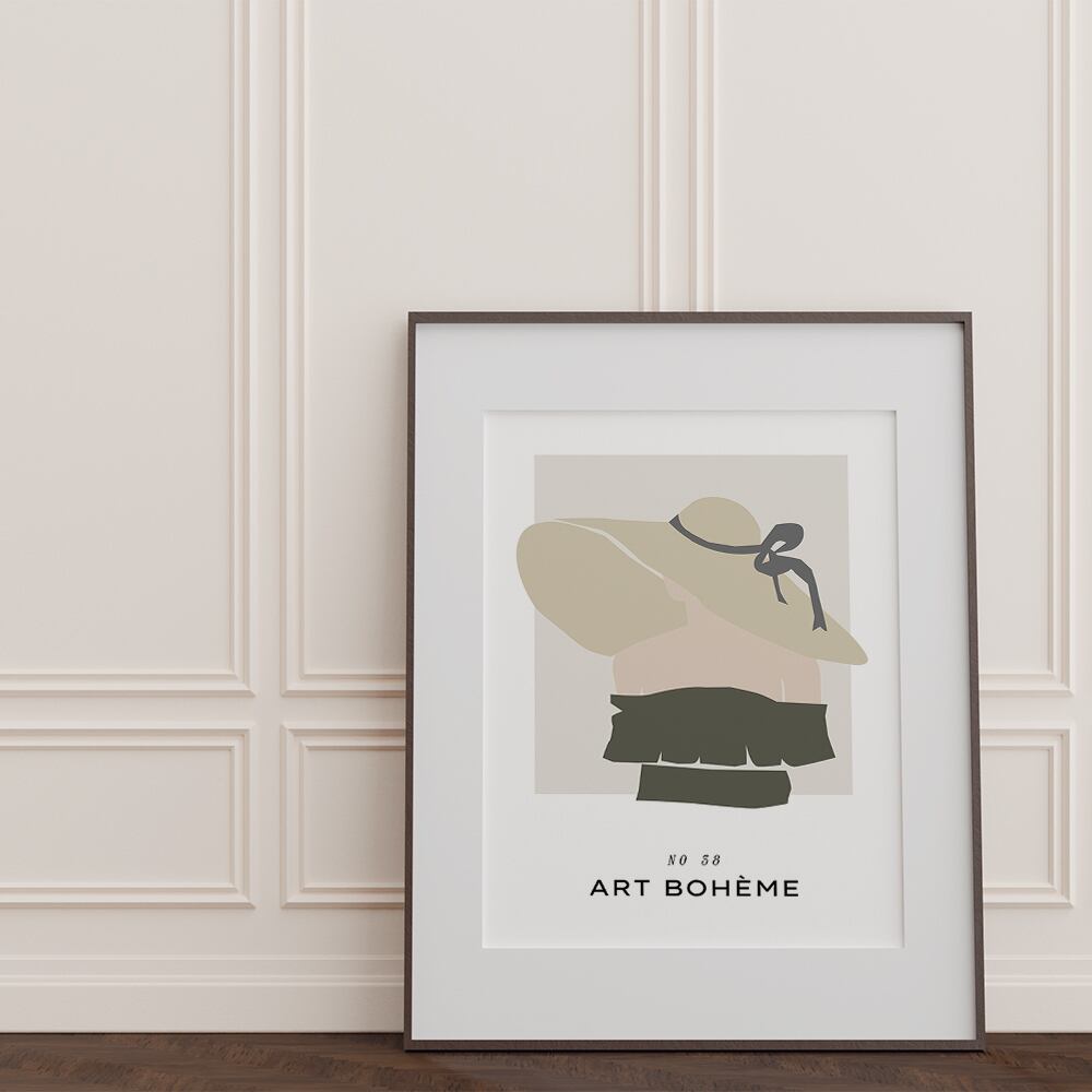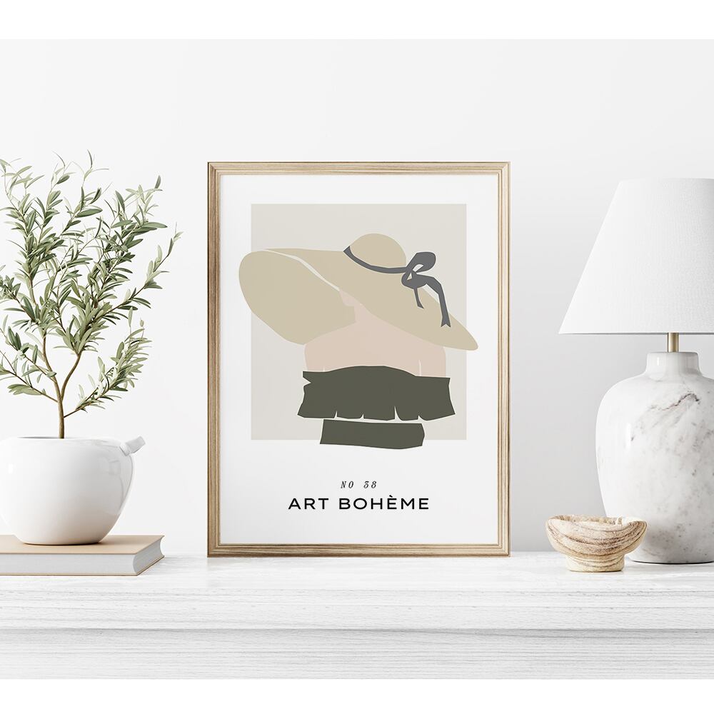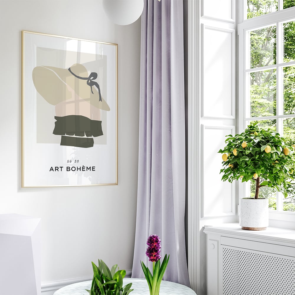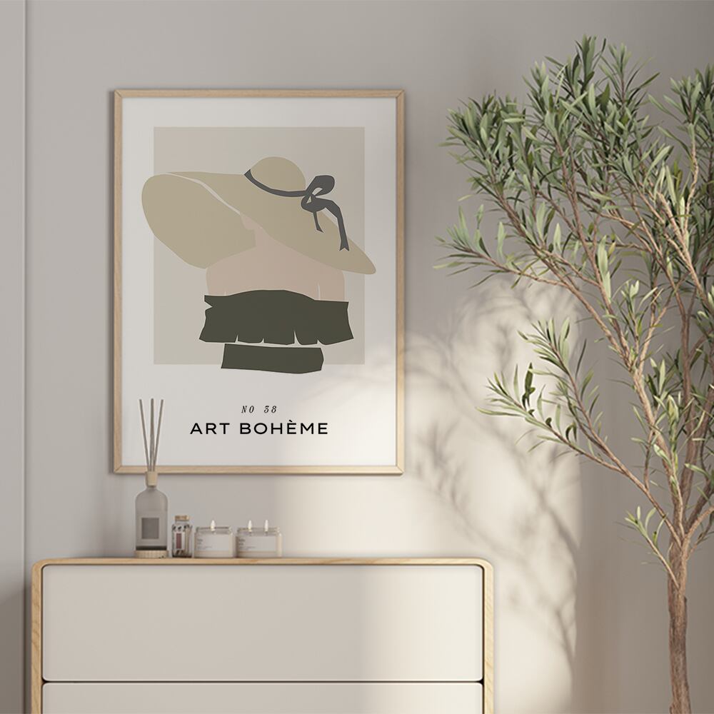 女性や、葉っぱや花、アボカド、洋梨、レモンなど夏らしいモチーフを使ったアートポスターです。淡いトーンのくすんだ色合いで仕上げています。