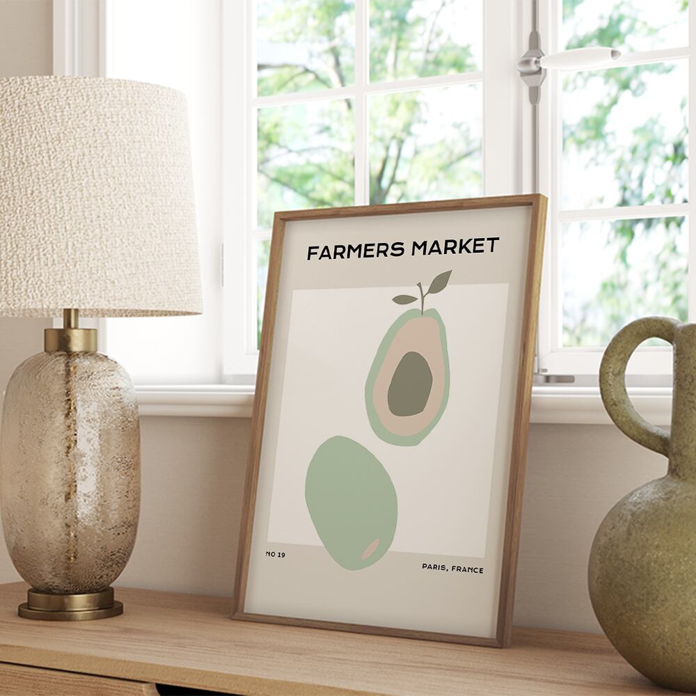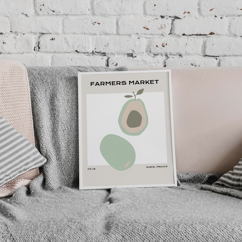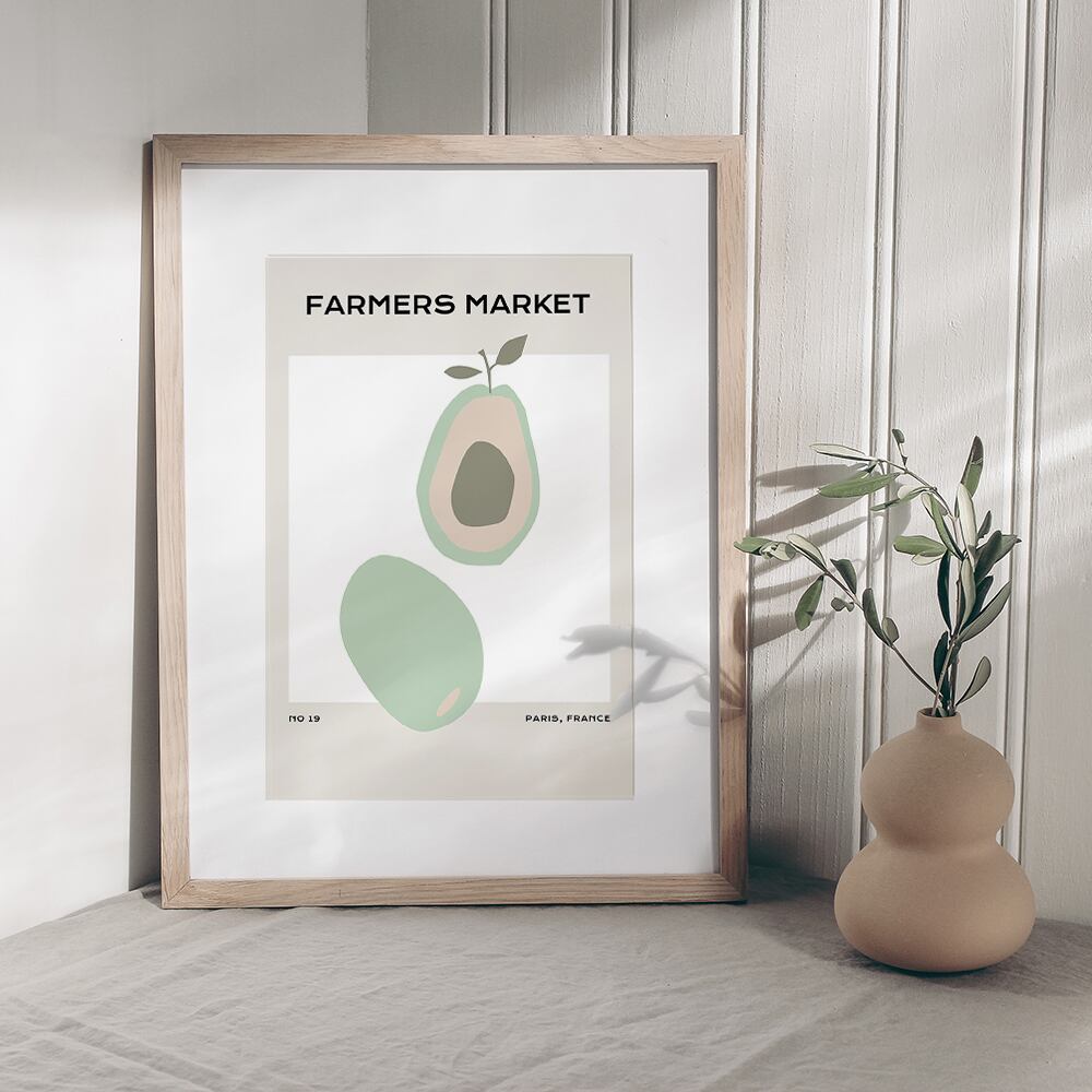 女性や、葉っぱや花、アボカド、洋梨、レモンなど夏らしいモチーフを使ったアートポスターです。淡いトーンのくすんだ色合いで仕上げています。