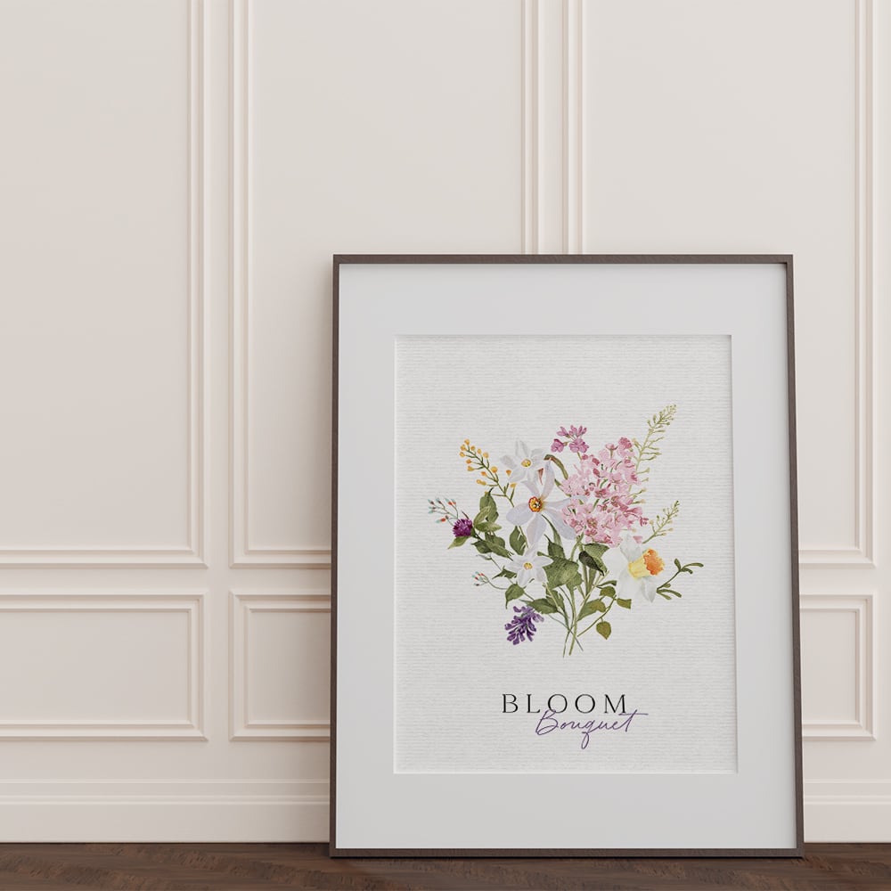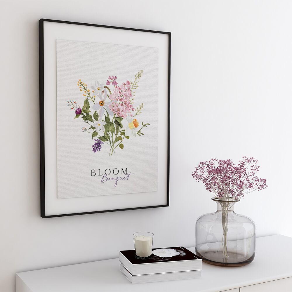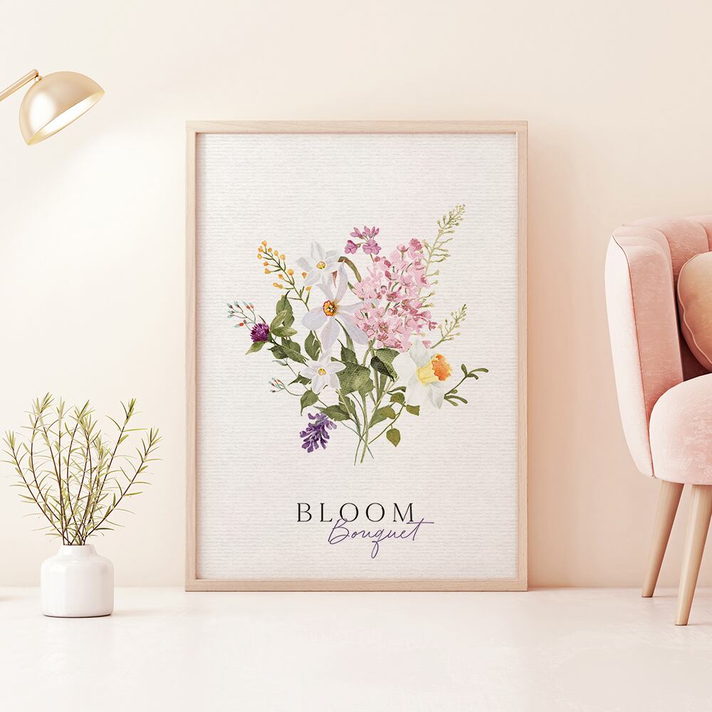 ライラックやチューリップ、水仙やミモザ、千日紅などのお花が束になっているポスターです。紫やピンク、白や黄色で品良くまとまっています。花束タイプやリースタイプなど、お好みのものをお選びください♪