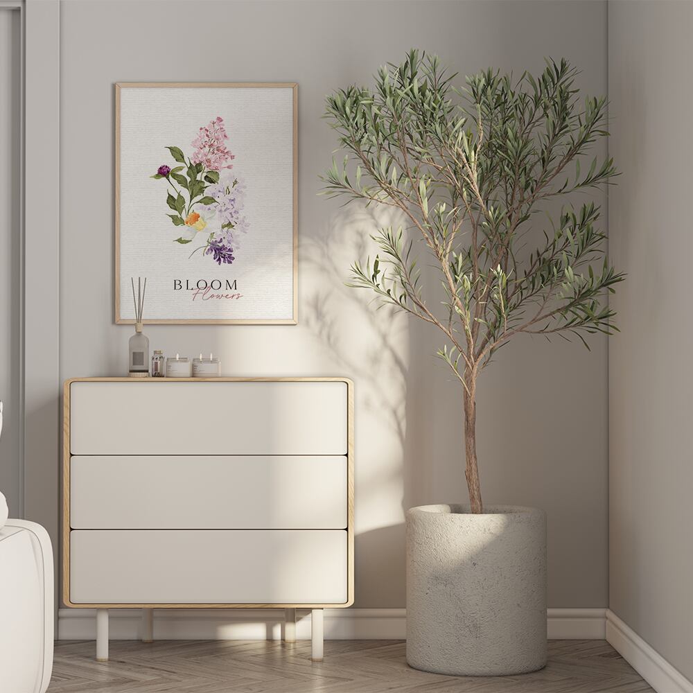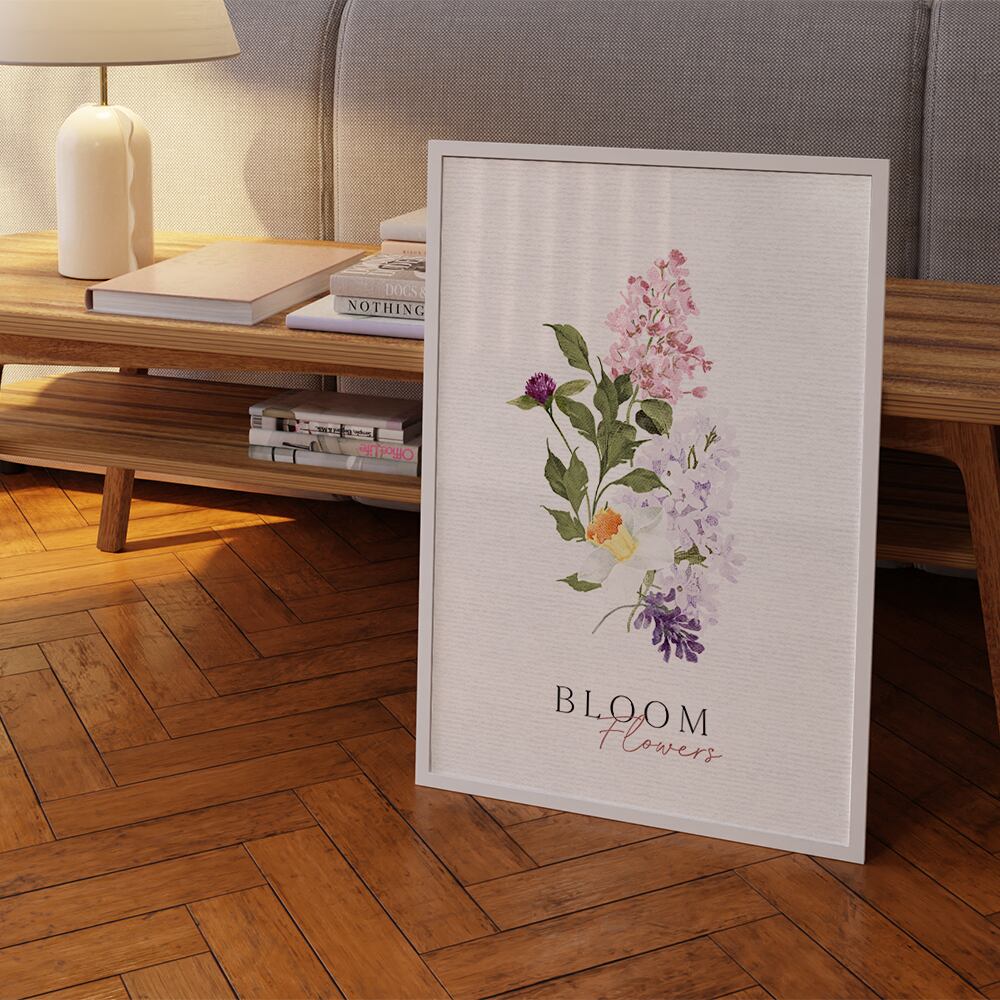 ライラックやチューリップ、水仙やミモザ、千日紅などのお花が束になっているポスターです。紫やピンク、白や黄色で品良くまとまっています。花束タイプやリースタイプなど、お好みのものをお選びください♪