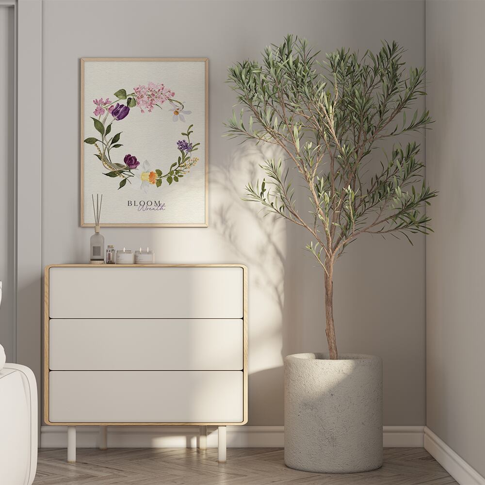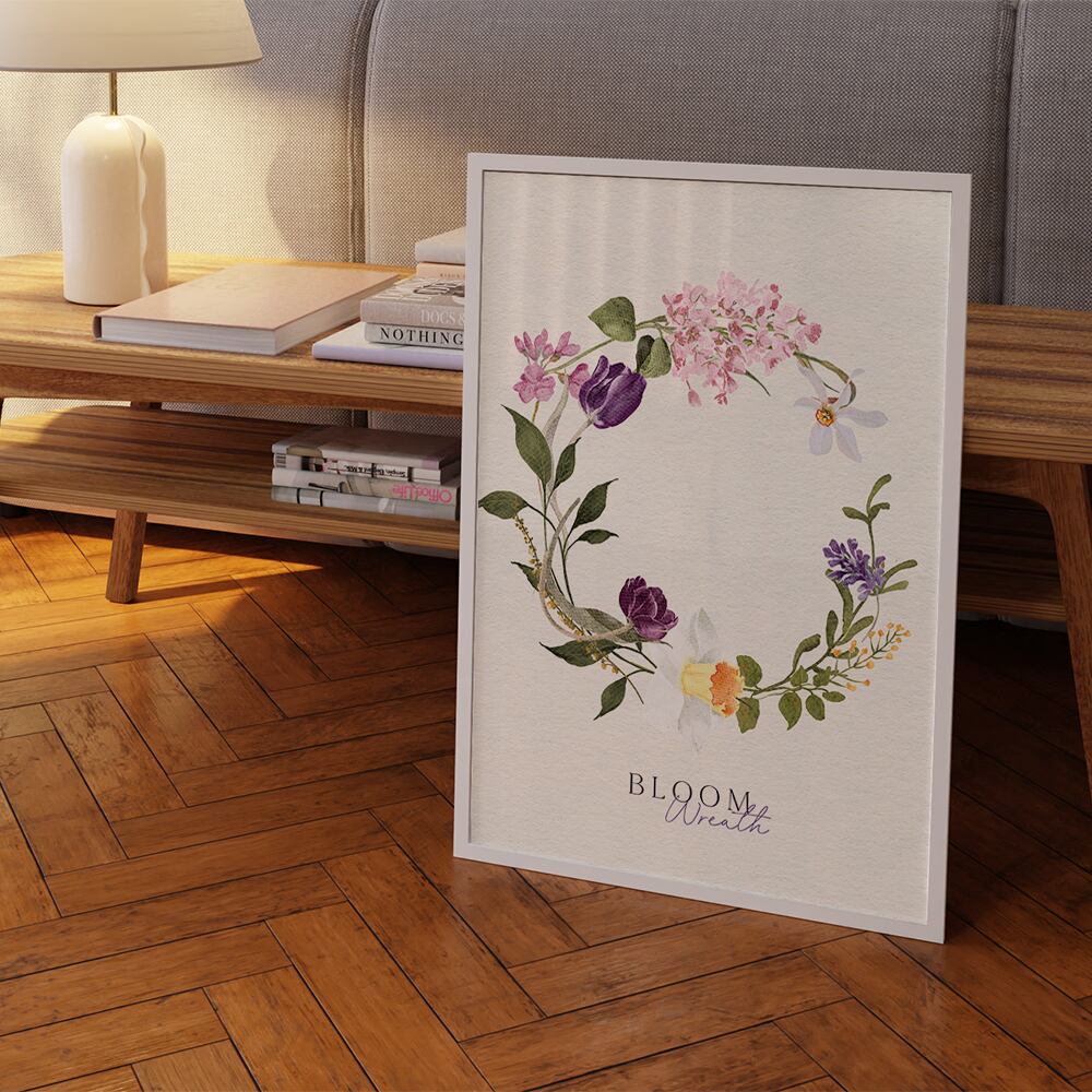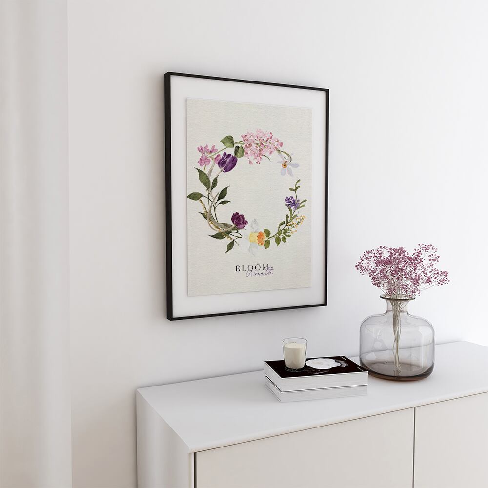 ライラックやチューリップ、水仙やミモザ、千日紅などのお花が束になっているポスターです。紫やピンク、白や黄色で品良くまとまっています。花束タイプやリースタイプなど、お好みのものをお選びください♪