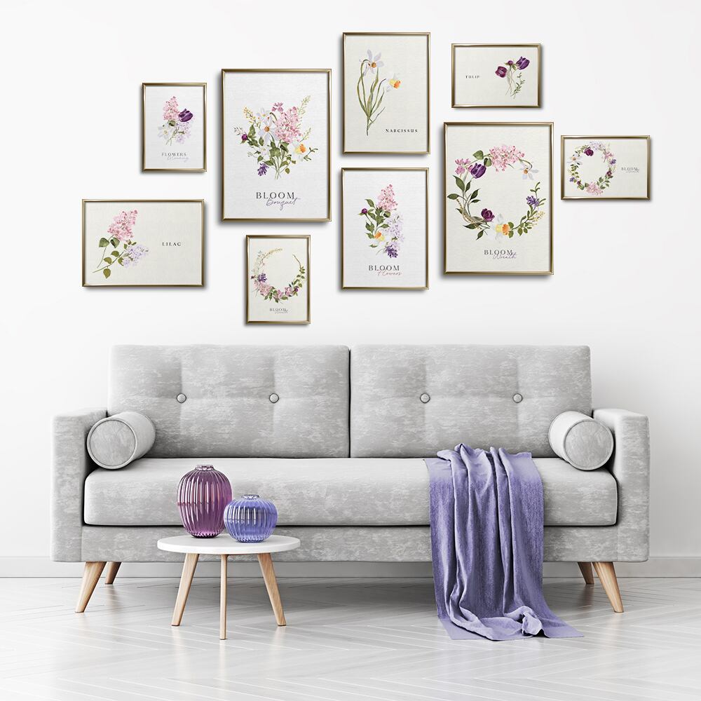 ライラックやチューリップ、水仙やミモザ、千日紅などのお花が束になっているポスターです。紫やピンク、白や黄色で品良くまとまっています。花束タイプやリースタイプなど、お好みのものをお選びください♪