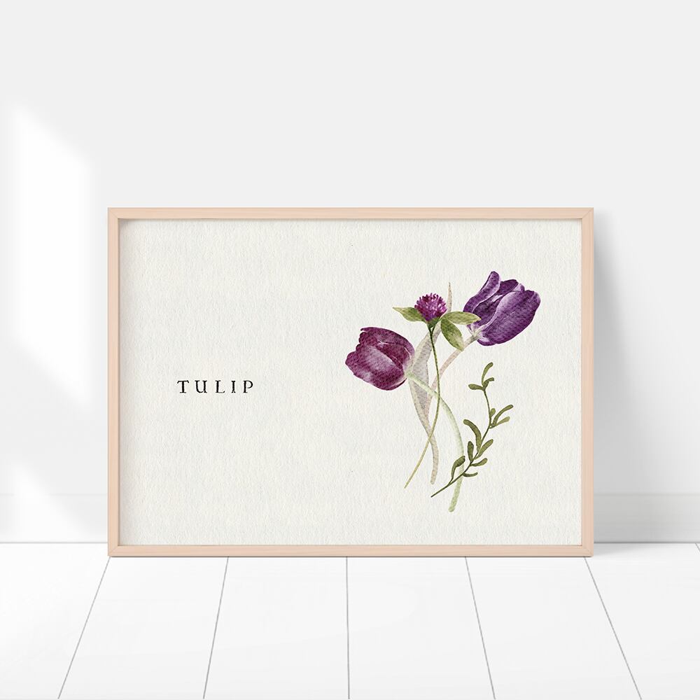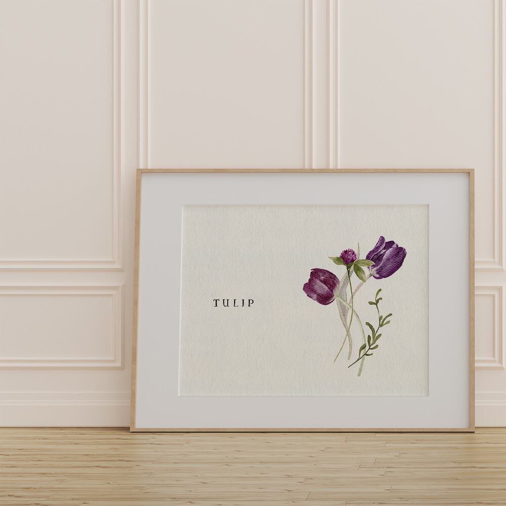 ライラックやチューリップ、水仙やミモザ、千日紅などのお花が束になっているポスターです。紫やピンク、白や黄色で品良くまとまっています。花束タイプやリースタイプなど、お好みのものをお選びください♪